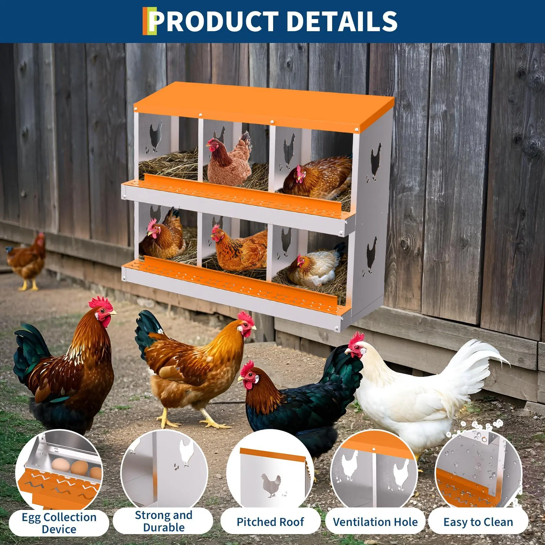 5. Chicken Nesting Boxes 6 Holes Galvanized Steel Rustproof Egg Laying Box with Egg Collection Systems, Hen Eggs Laying Box, Ventilated/Easy to Install, for Chicken House/Duck House/Hen,Orange