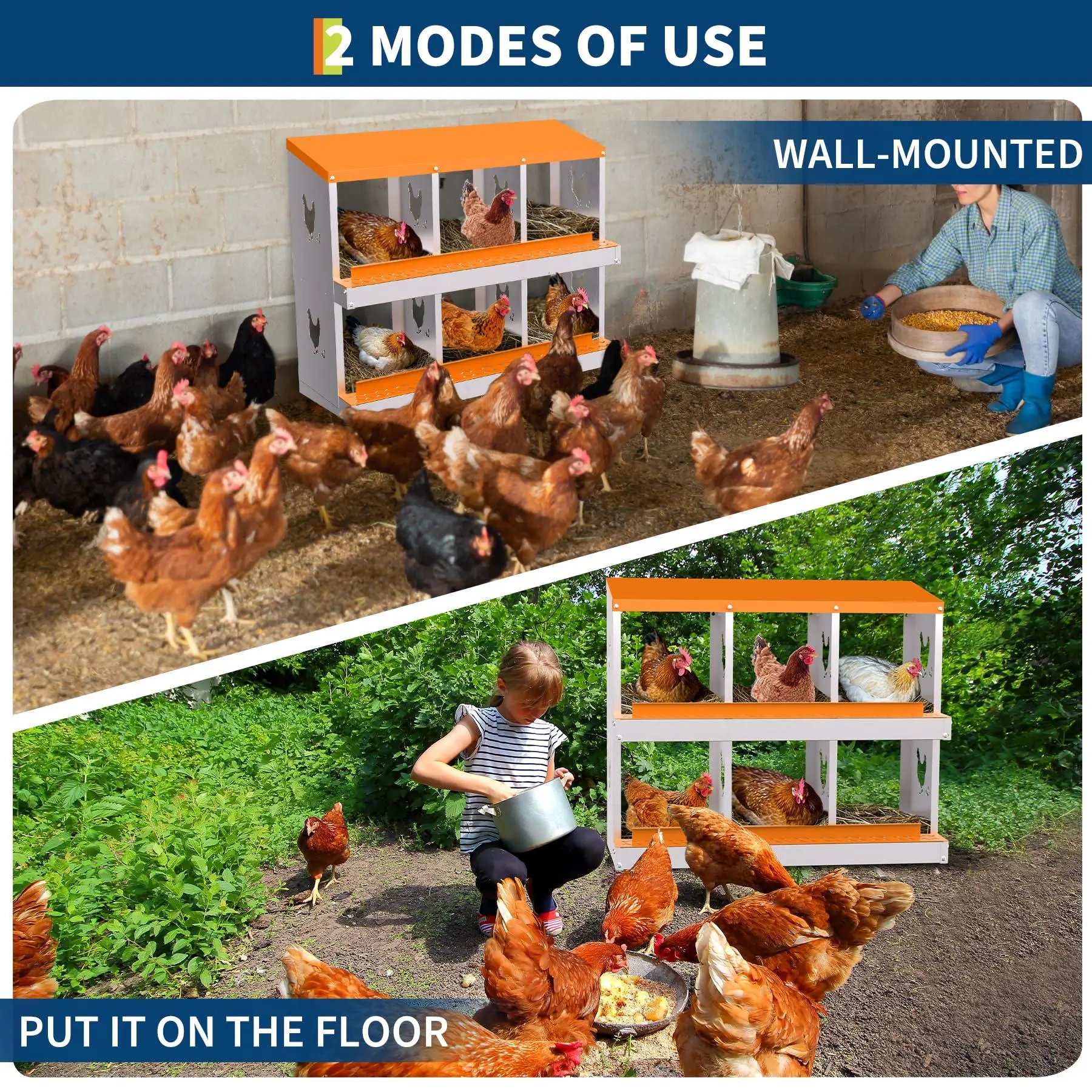 【Flexible & Easy Installation – Wall or Freestanding】: Enjoy versatility with both wall-mounted and freestanding installation options. Pre-drilled holes, included hardware, and intuitive instructions allow for quick setup—making it easy to adapt your    nesting box to any coop layout or flock size. Modular and stackable, it provides convenient solutions for farms and small backyards alike.