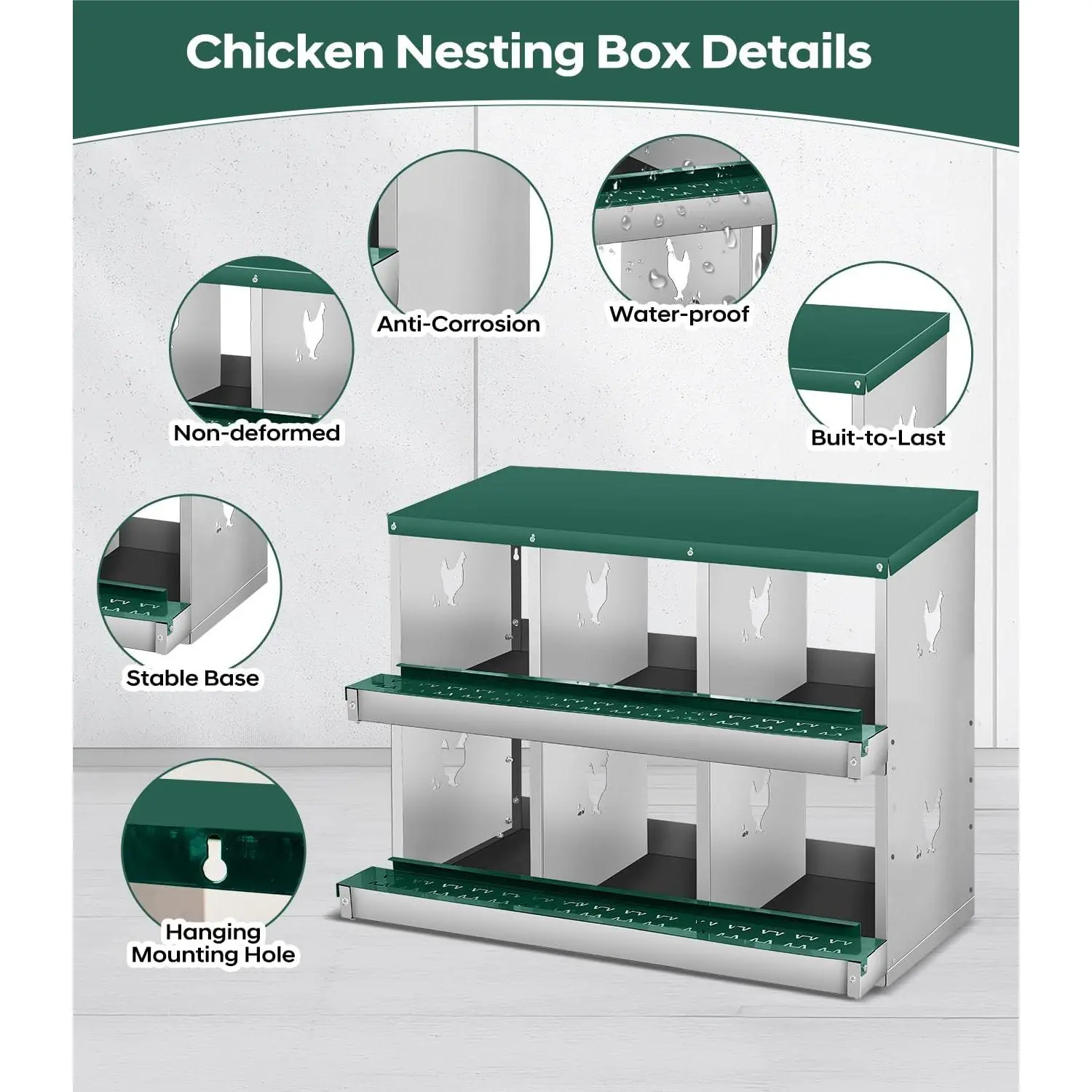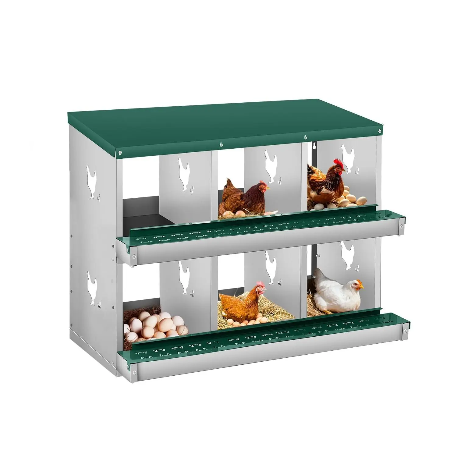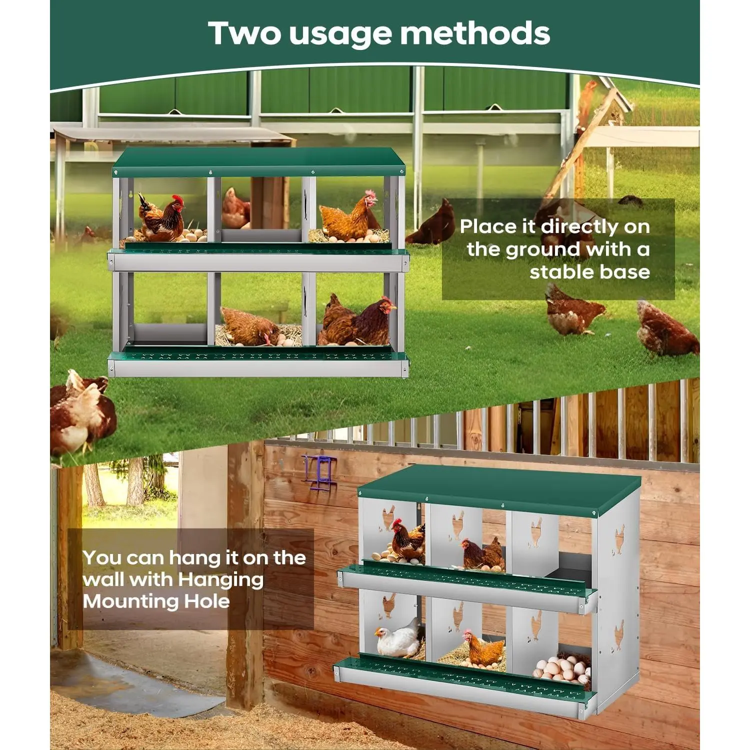 6-Compartment Chicken Nesting Box, 2-Tier Galvanized Steel Egg Laying Box with Large Vented Holes, Wall-Mountable Design, Easy Egg Collection & Cleaning for Chickens - Green