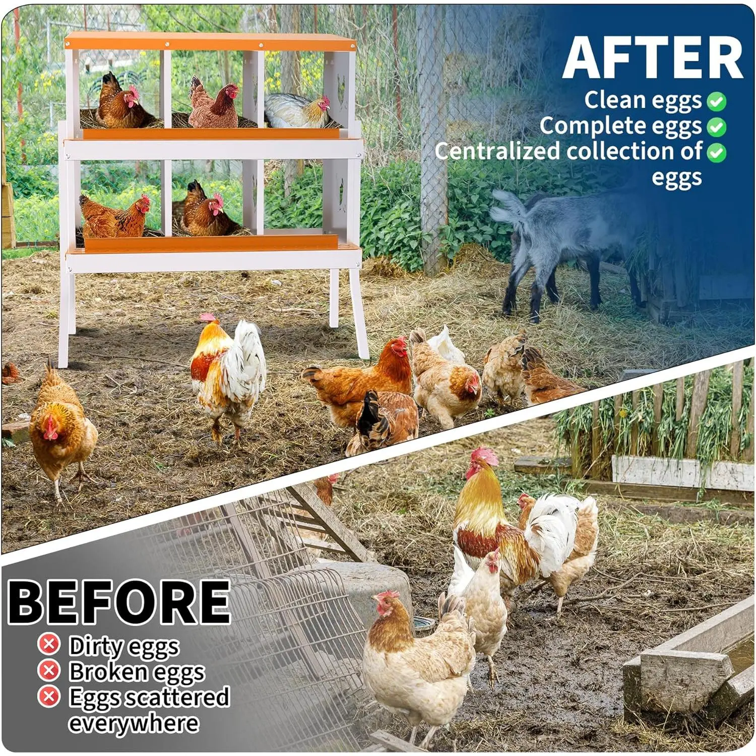 【Optimized Layout for Maximum Egg Production】: Featuring a spacious, well-ventilated design with a sloped roof, this nesting box ensures comfort and reduces stress for hens, naturally boosting egg laying efficiency. The roomy compartments create a private    and cozy environment to encourage hens, ducks, or geese to lay more eggs while protecting eggs from damage.