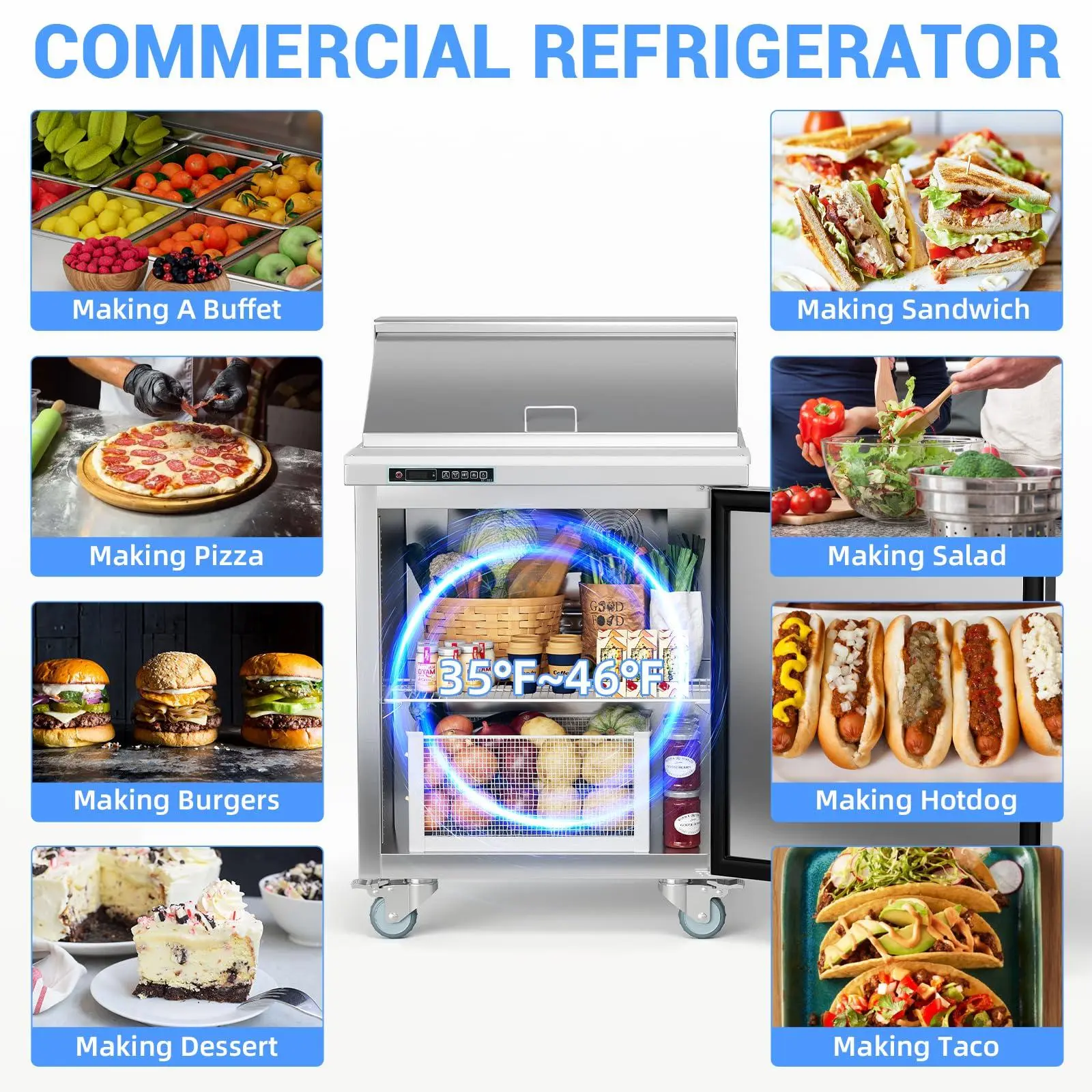 Multi-functional Work Surface: The commercial refrigerator spacious 15.5 in cutting board and 12 Pans of the salad prep table provide ample workspace for cutting vegetables, mincing meat or making gourmet food. The height is suitable for the use habits of most chefs, and the countertop operation and handling saves kitchen space and is also easy to keep tidy.