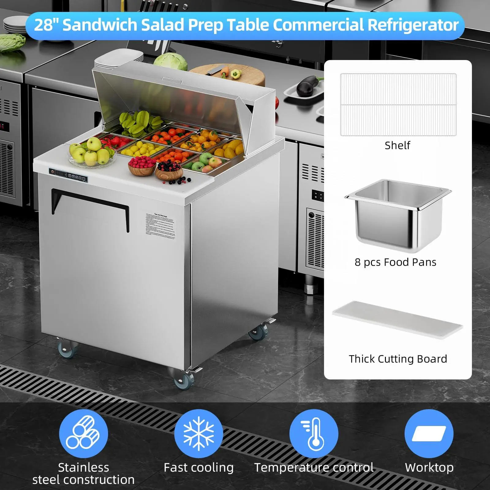 Smart Design: This stainless steel refrigerated is equipped with a removable cutting board, and heavy-duty wheels with brakes, which can be freely moved and positioned. Strictly standardized door locks and keys, 90-degree automatic door closing with removable door seal, designed for commercial kitchen use.