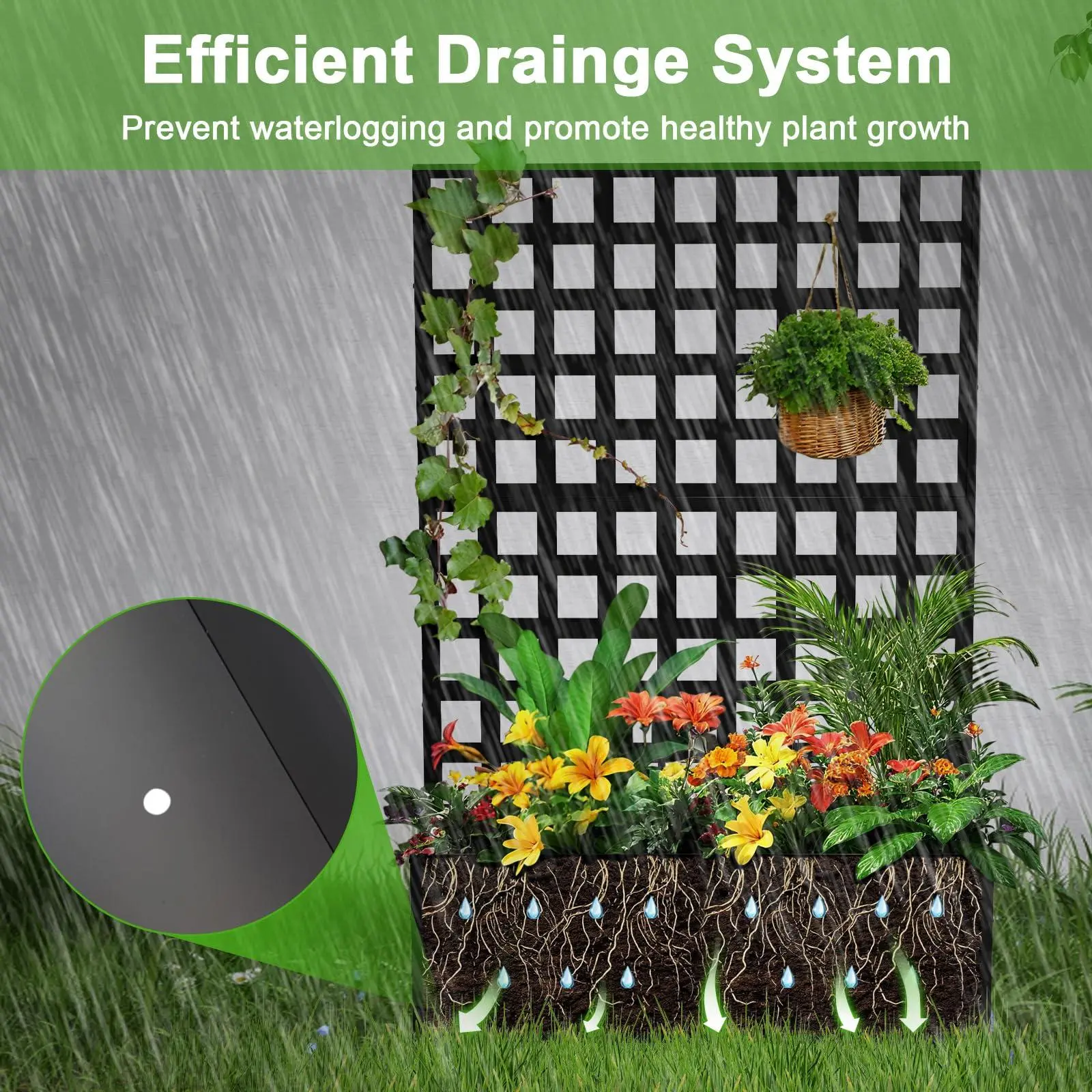 【Effective Drainage System】--This planter box features a 15.75" deep planting bed with drainage holes to promote water drainage and root aeration, preventing root rot and ensuring your plants get the ideal amount of moisture they need for healthy growth.    No need to worry about daily maintenance.