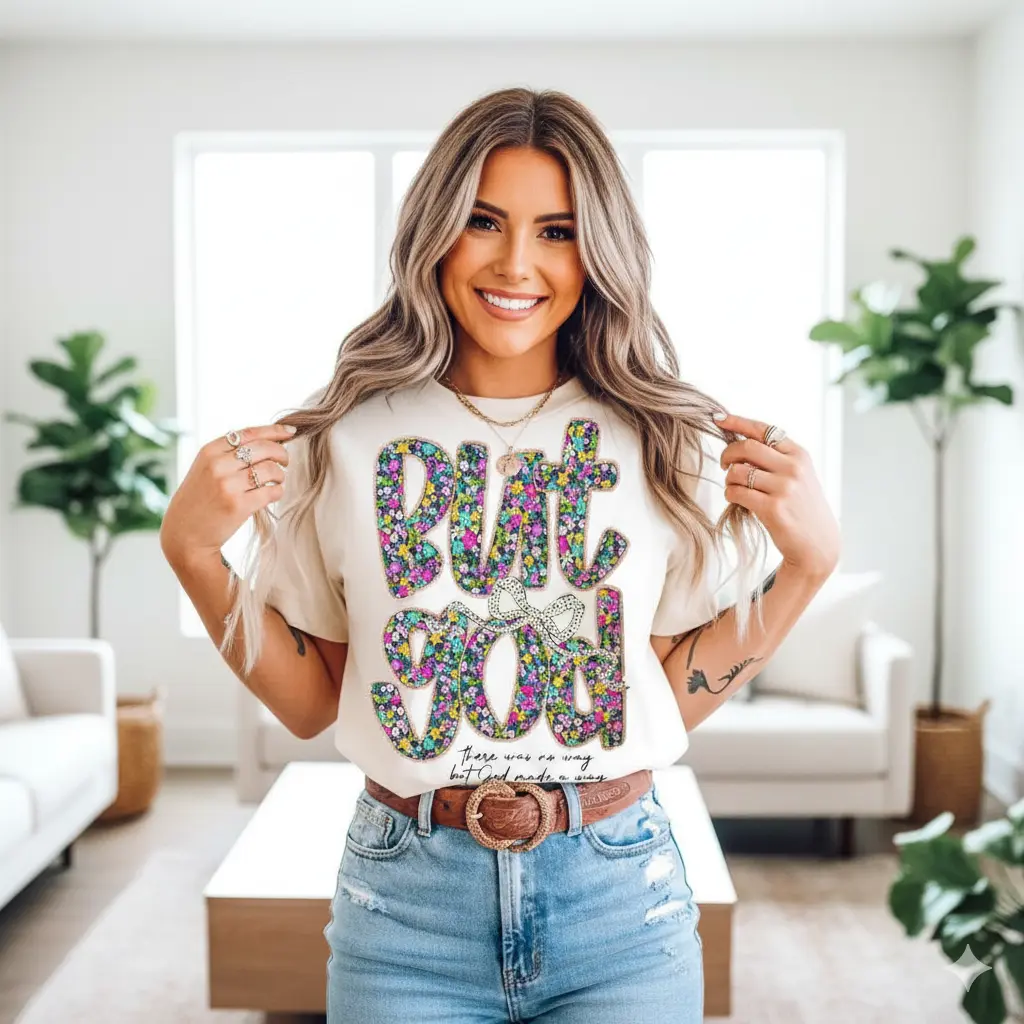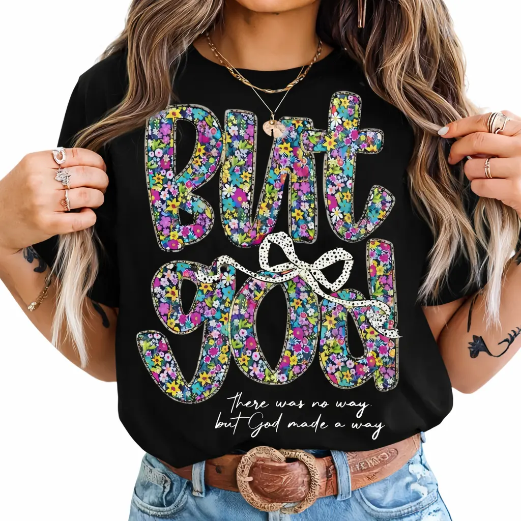 Flowers Floral But God Women Shirt, Christian Clothing cotton Tee, Gift for Her, Jesus Apparel, Religious Top Comfort Summer Womenswear BLACK/WHITE Casual