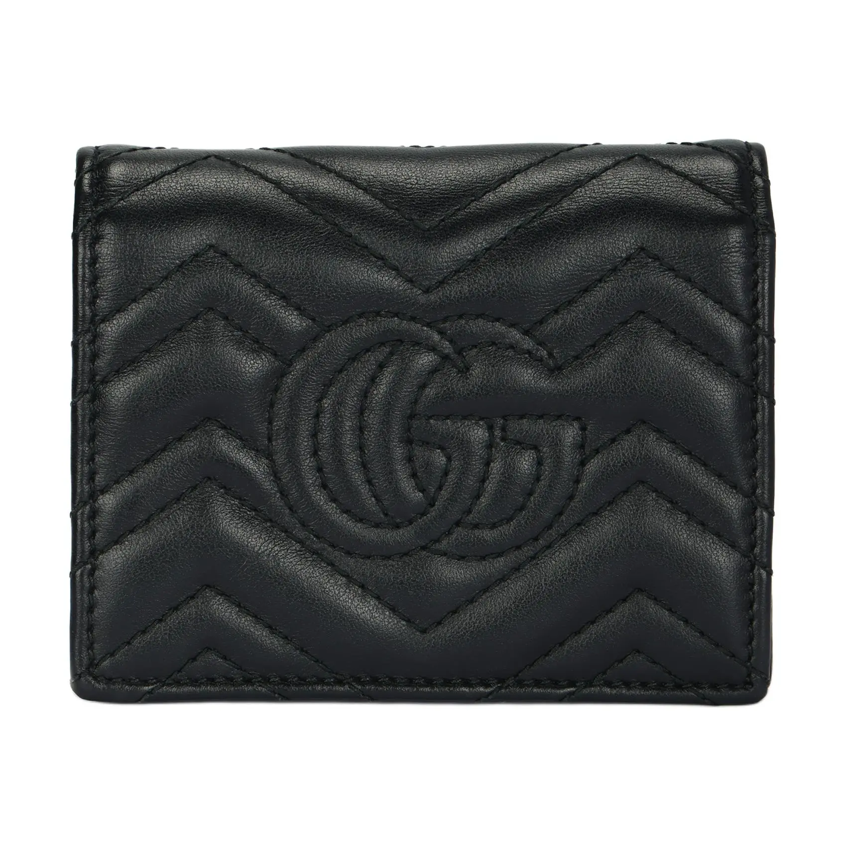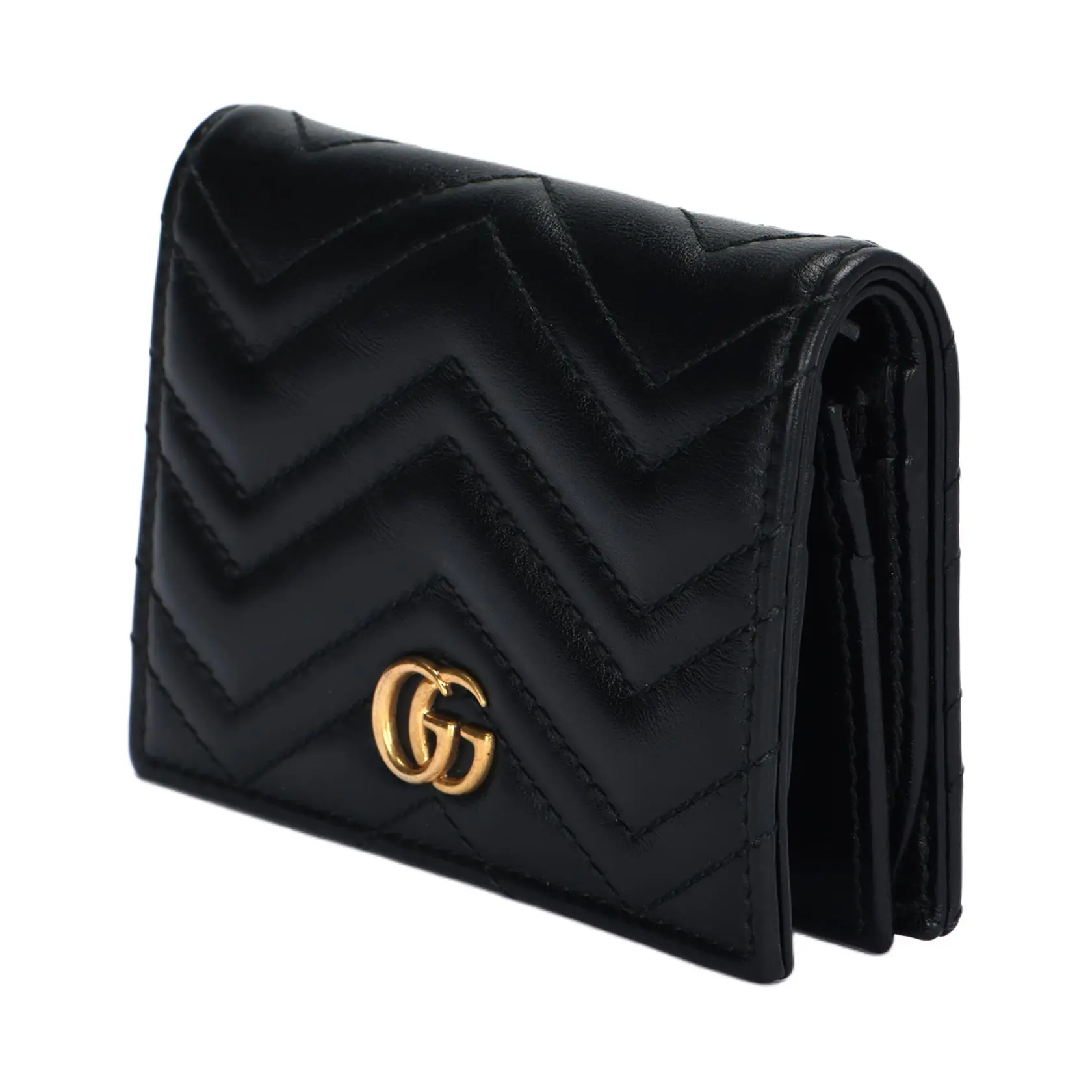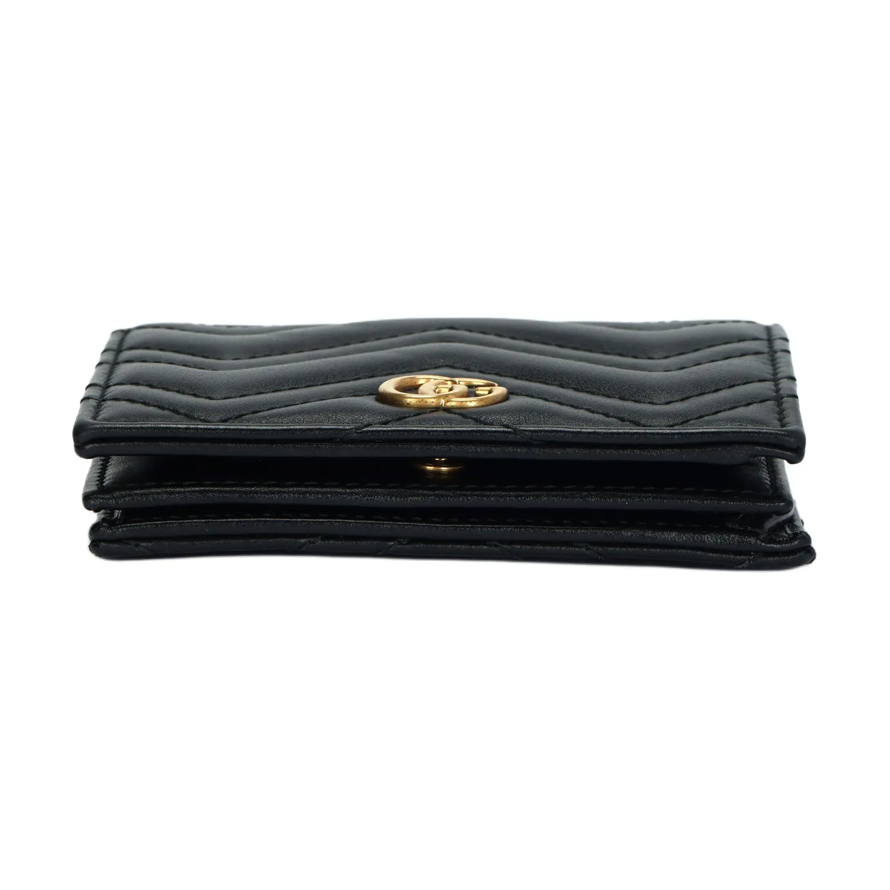 Materials: Premium Italian calf leather with tonal chevron quilting. Lining: Soft beige microfiber. Hardware: Antique-gold-finished brass GG logo.