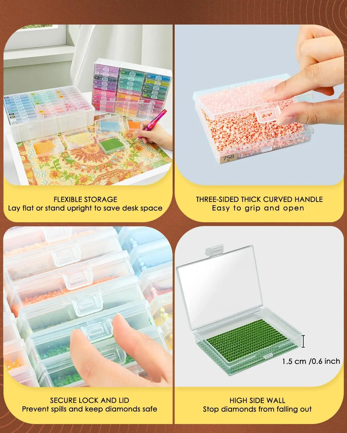 ·Easy Sorting, Spill-Proof Design: The diamond art trays with lids feature a frosted bottom to easily distinguish between the canvas and diamonds. The curved handle ensures a comfortable grip, while the high sidewalls allow for quick sorting by tilting the tray. The secure lid and locking design prevent spills, keeping diamonds neat even if dropped. This diamond painting storage solution is perfect for diamond painting storage containers, diamond painting accessories, and diamond painting trays.