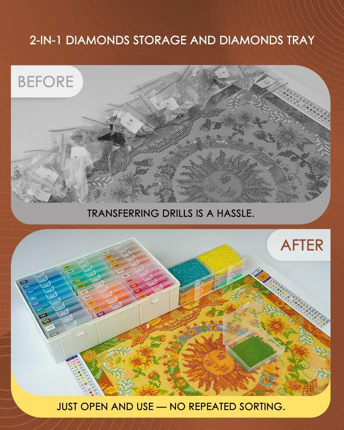 ·2-in-1 Diamond Art Storage Tray: This diamond art tray combines a tray and built-in storage case, eliminating the need to transfer beads. Simply open the lid to start crafting. A must-have tool for diamond art enthusiasts, it keeps your diamond art beads and diamond art supplies organized. Ideal for diamond painting tools and diamond art storage case, this set simplifies your diamond art experience and helps maintain order. Perfect for diamond art accessories storage.