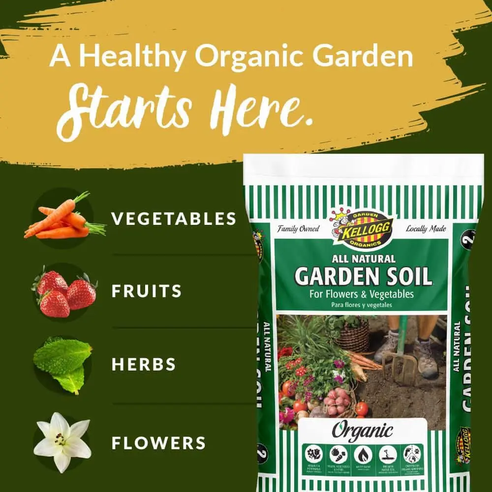 Revitalize your in-ground garden with this nutrient-rich, all-natural soil blend. Kellogg Garden All Natural Organics All Natural Garden Soil for Flowers and Vegetables enriches and fortifies your native soil. Specially crafted to enhance native soil, this premium mix combines aged wood fines and organic materials to create the perfect foundation for growing vibrant flowers and vegetables. Designed to reduce soil compaction and improve moisture retention, all while supporting healthy plant growth.When planting, mix the organic garden soil 50:50 with the native soil in your garden beds. Plant your flowers or vegetables, water thoroughly, and watch them thrive!Pro Gardening Tip: Boost growth by mixing in organic granular plant food when planting, then reapply every 5-6 weeks.