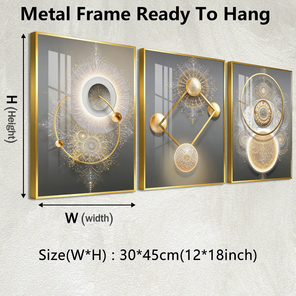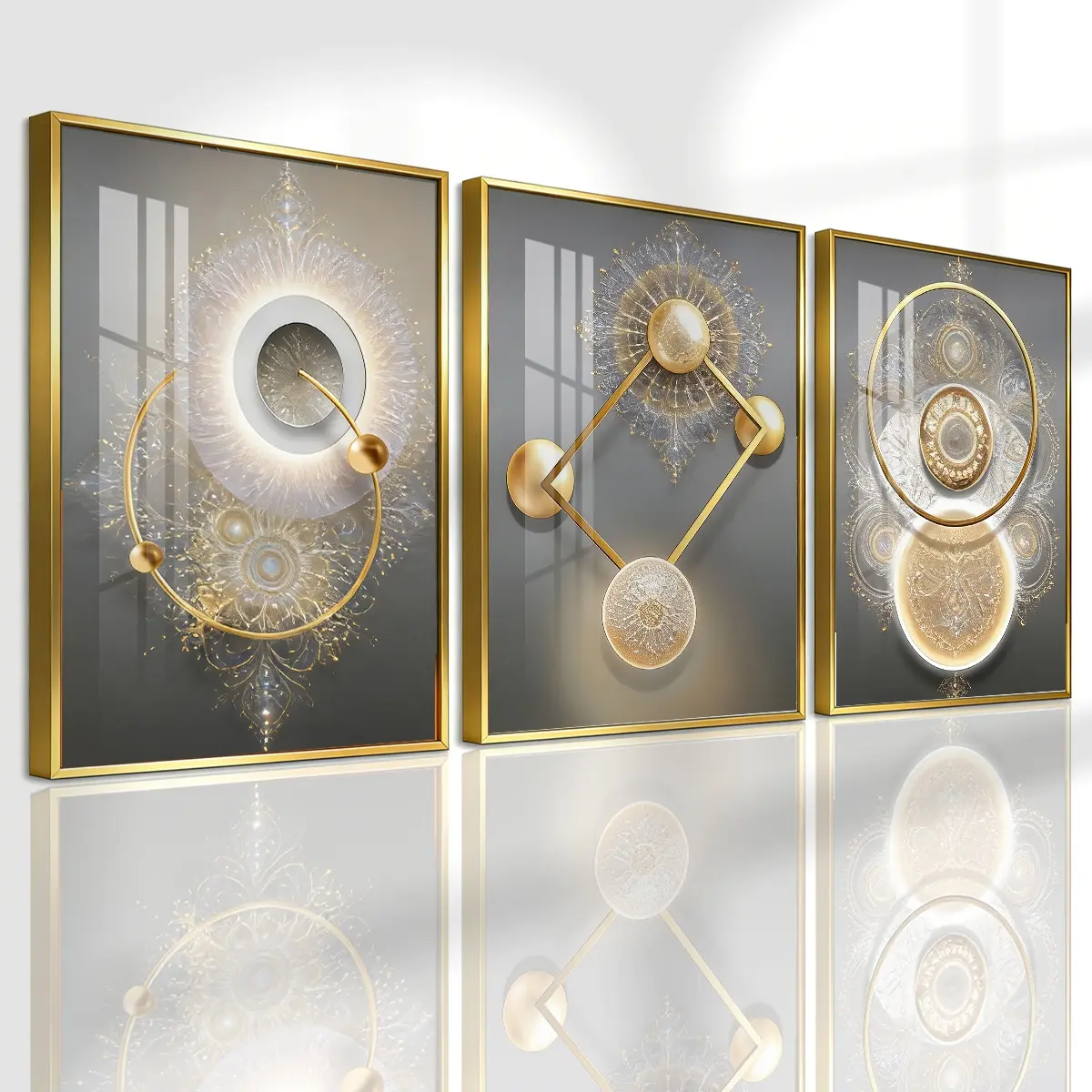 3 Counts Aluminum Alloy Framed Painting, Golden Abstract Geometry Light Art, Home Decoration For Living Room, Bedroom, Office, Restaurant, Hallway Wall Decor, Odorless Print Artwork, Luxury Perfect Gift For Friends And Family