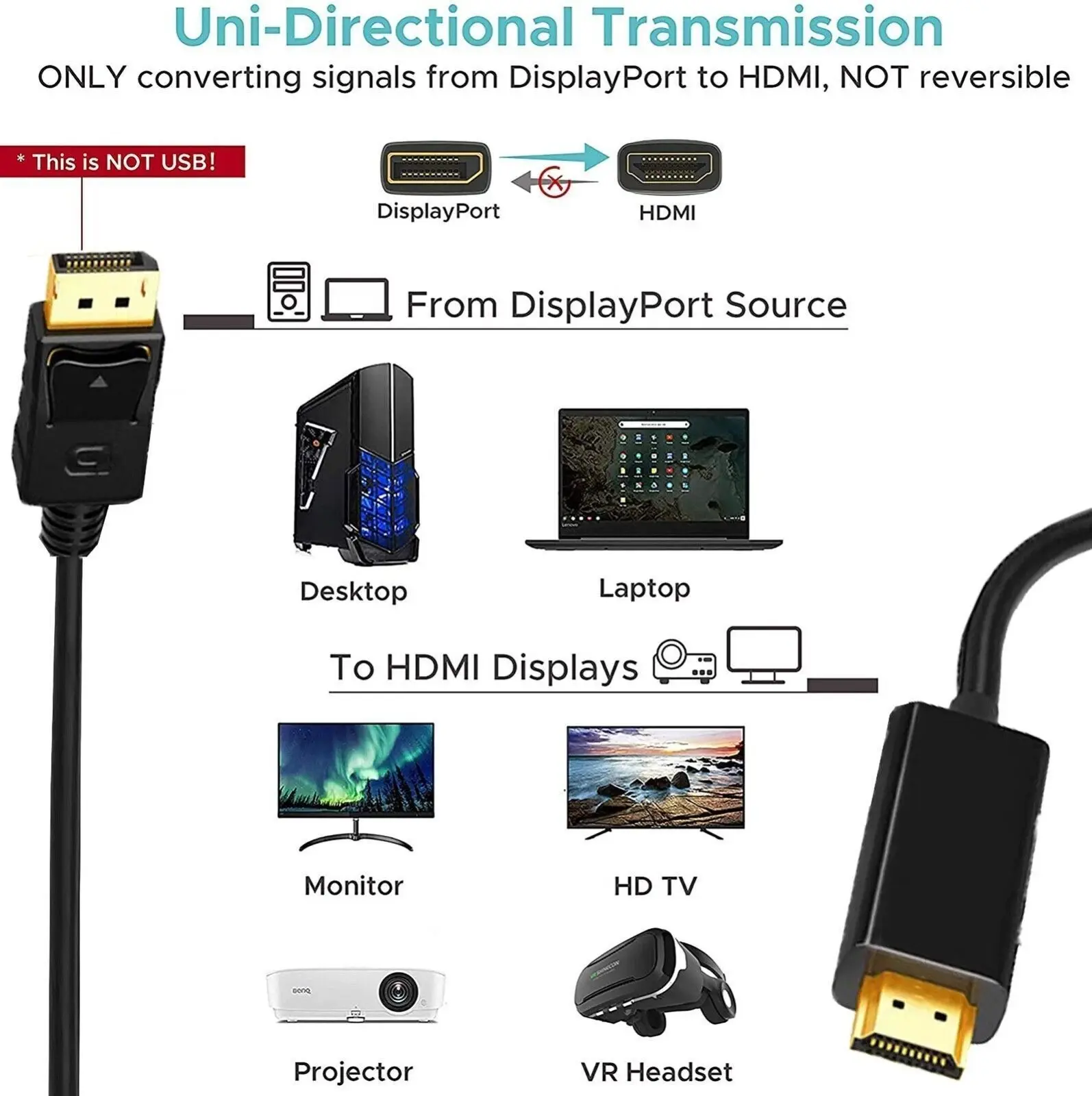 · 【Universal Compatibility】This DP to HDMI Cable is compatible with laptop, desktop tower, GPU (AMD, NVIDIA) and other devices with a DisplayPort. Connect to TV, projector, monitor, VR headset, etc.*Note: It is a UNI-DIRECTIONAL cable, only works to convert from DisplayPort source to HDMI display.