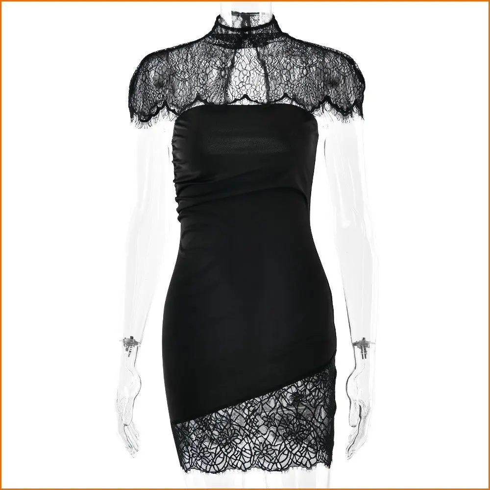 This sultry little black dress blends vintage-inspired glamour with modern bodycon appeal. Featuring a sheer lace capelet overlay and a curve-hugging base, its designed to turn heads on any night out.