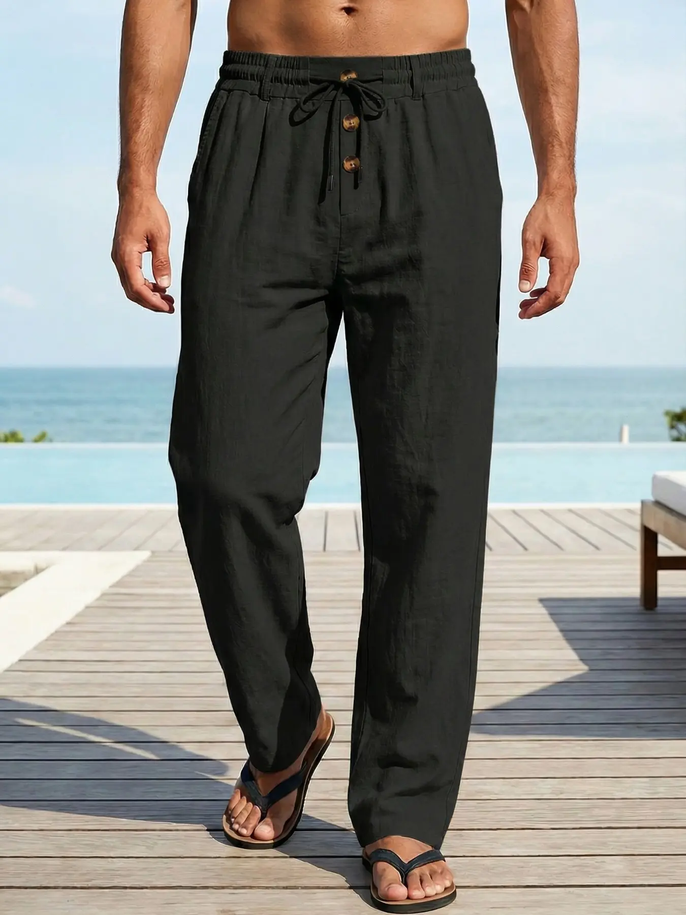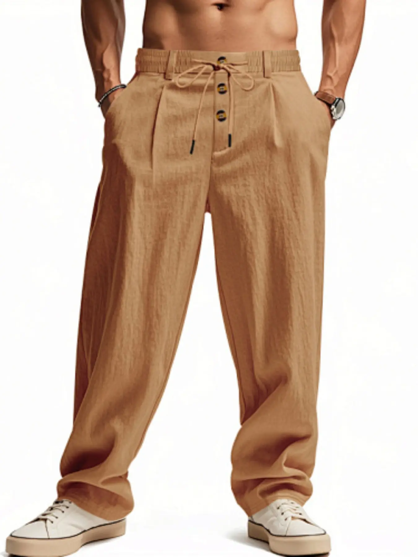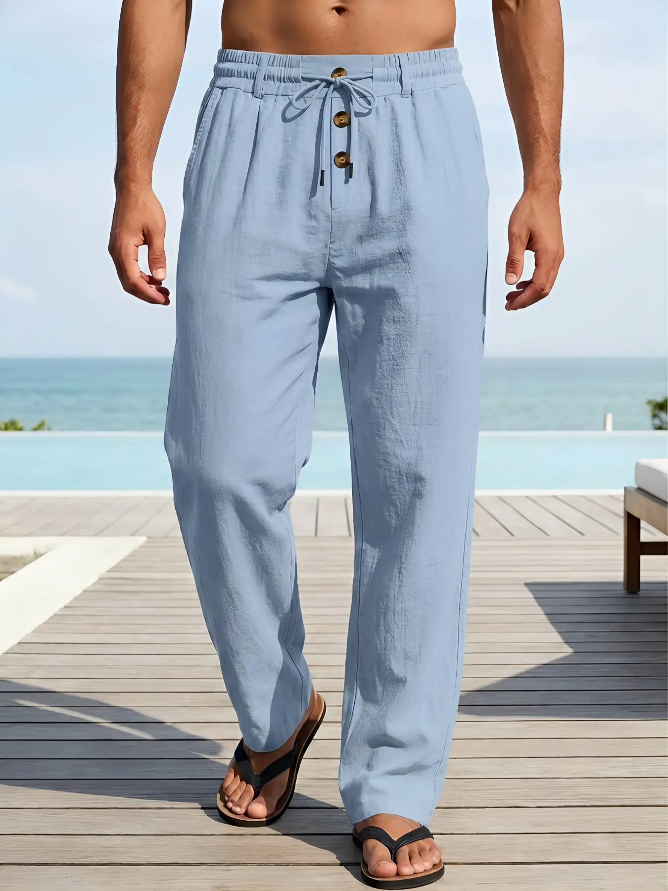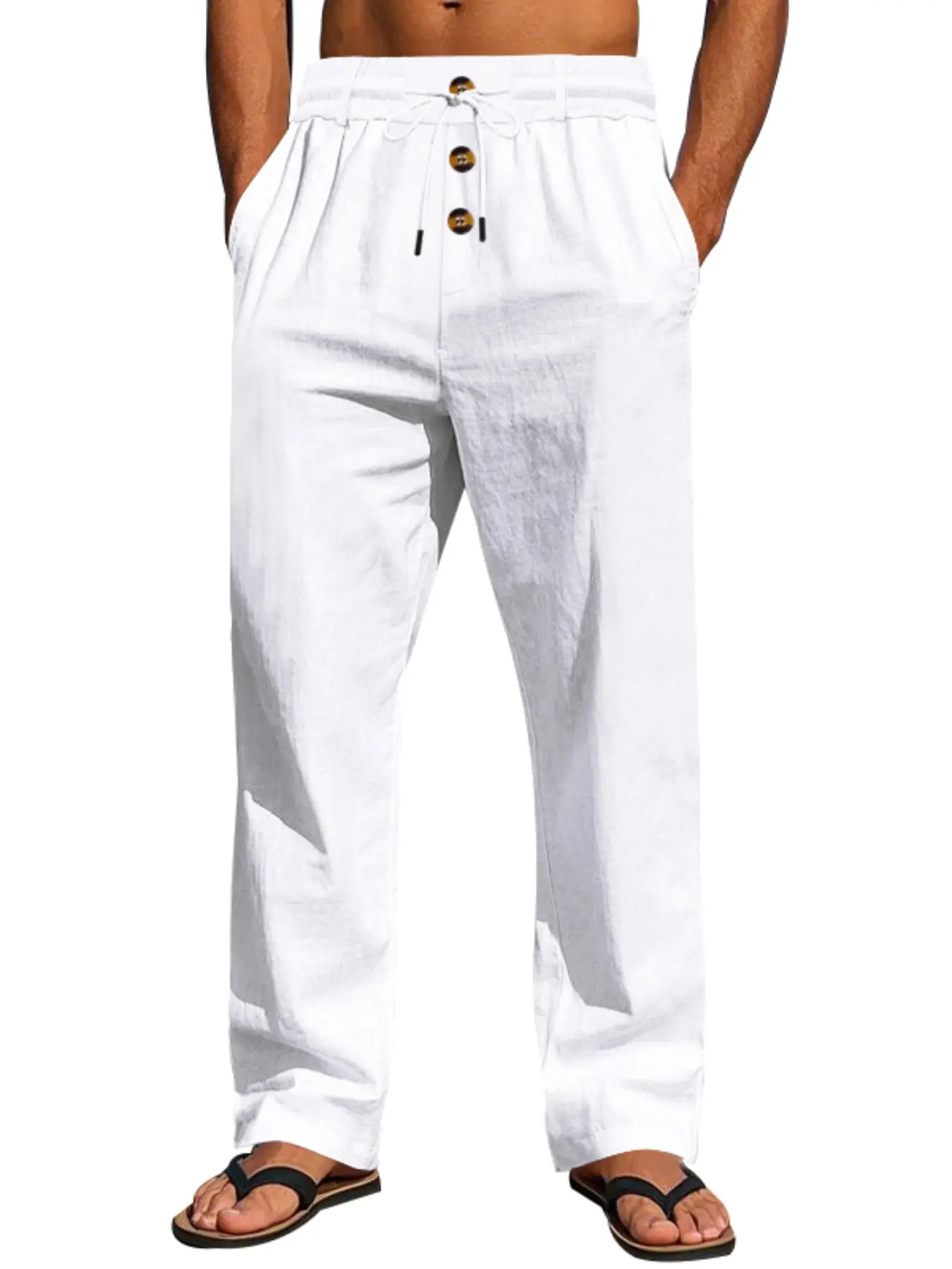Men's lightweight casual sportswear pants, featuring drawstring and multi-button design, stylish linen woven straight-leg trousers