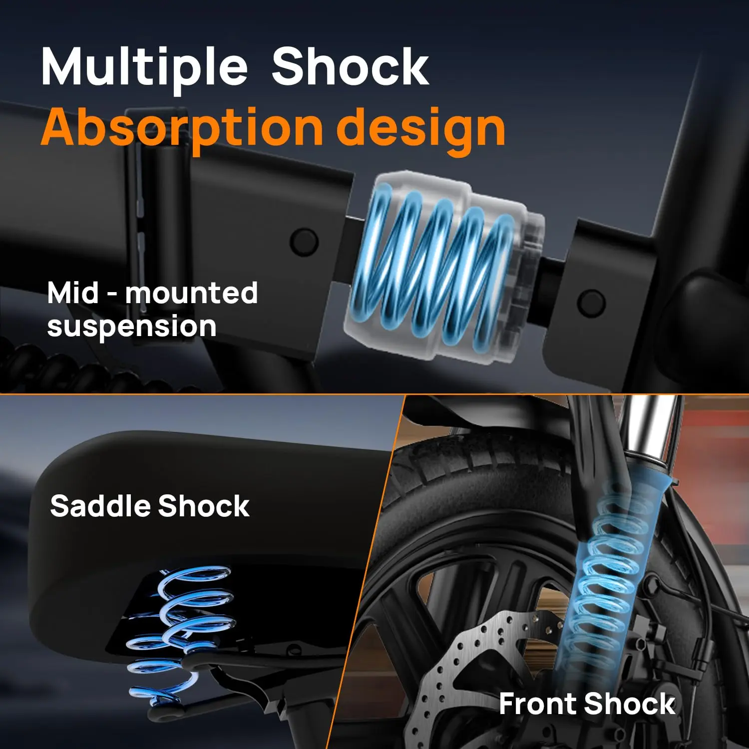 ·【Multi-Shock Absorption】Enjoy smooth rides thanks to advanced shock absorption—front fork, center, and seat damping reduce bumps for ultimate Electric Ebike comfort.