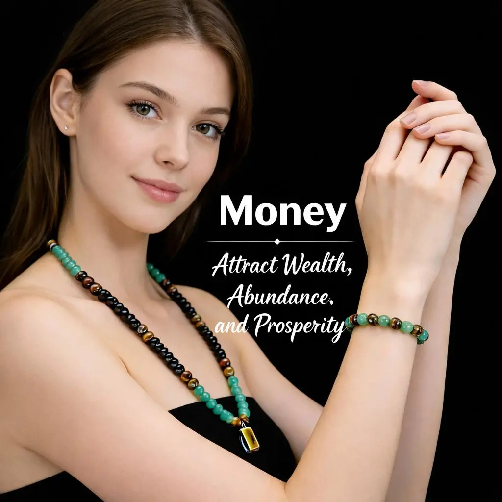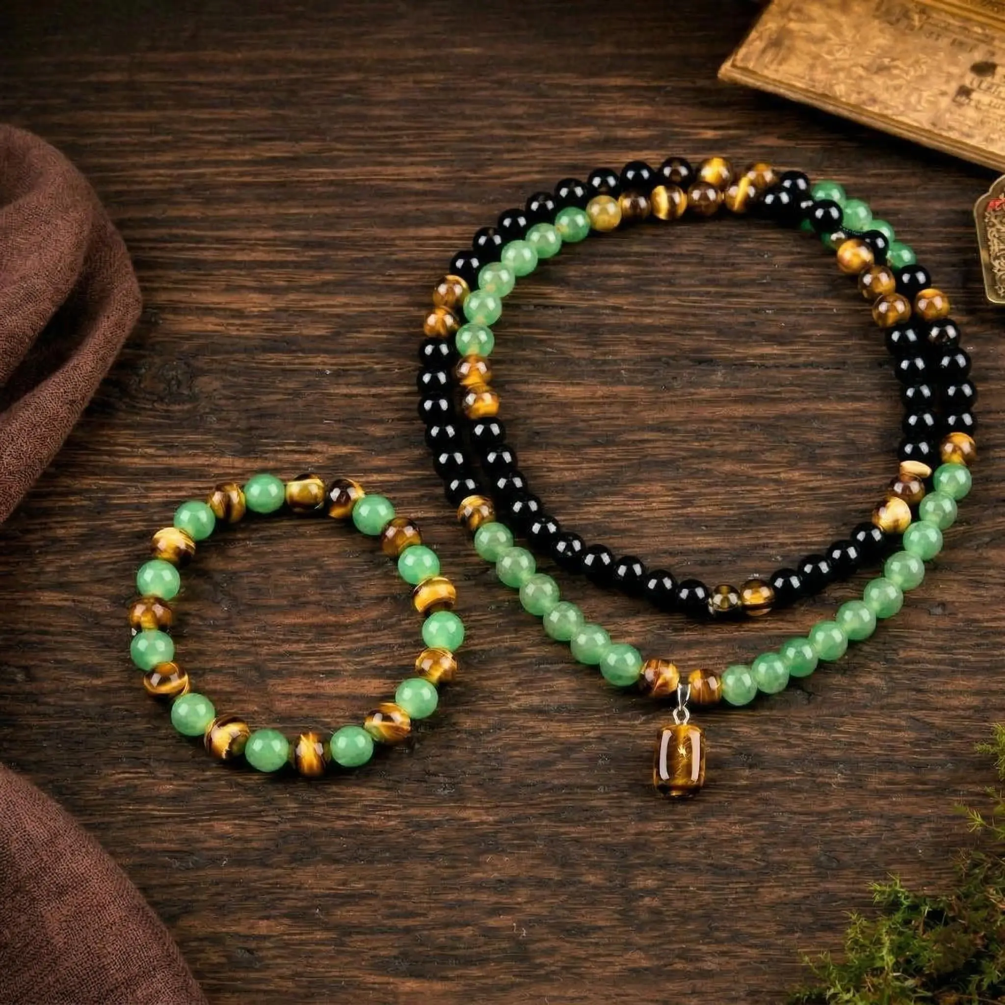 [Buy 1 Get 1 Free] Money Attraction Necklace Set with Green Aventurine and Tiger Eye Pendant Crystal Stones, Includes Matching Bracelet and Cloth Pouch, Perfect Gift for Birthdays, Holidays, Anniversaries, and Special Occasions