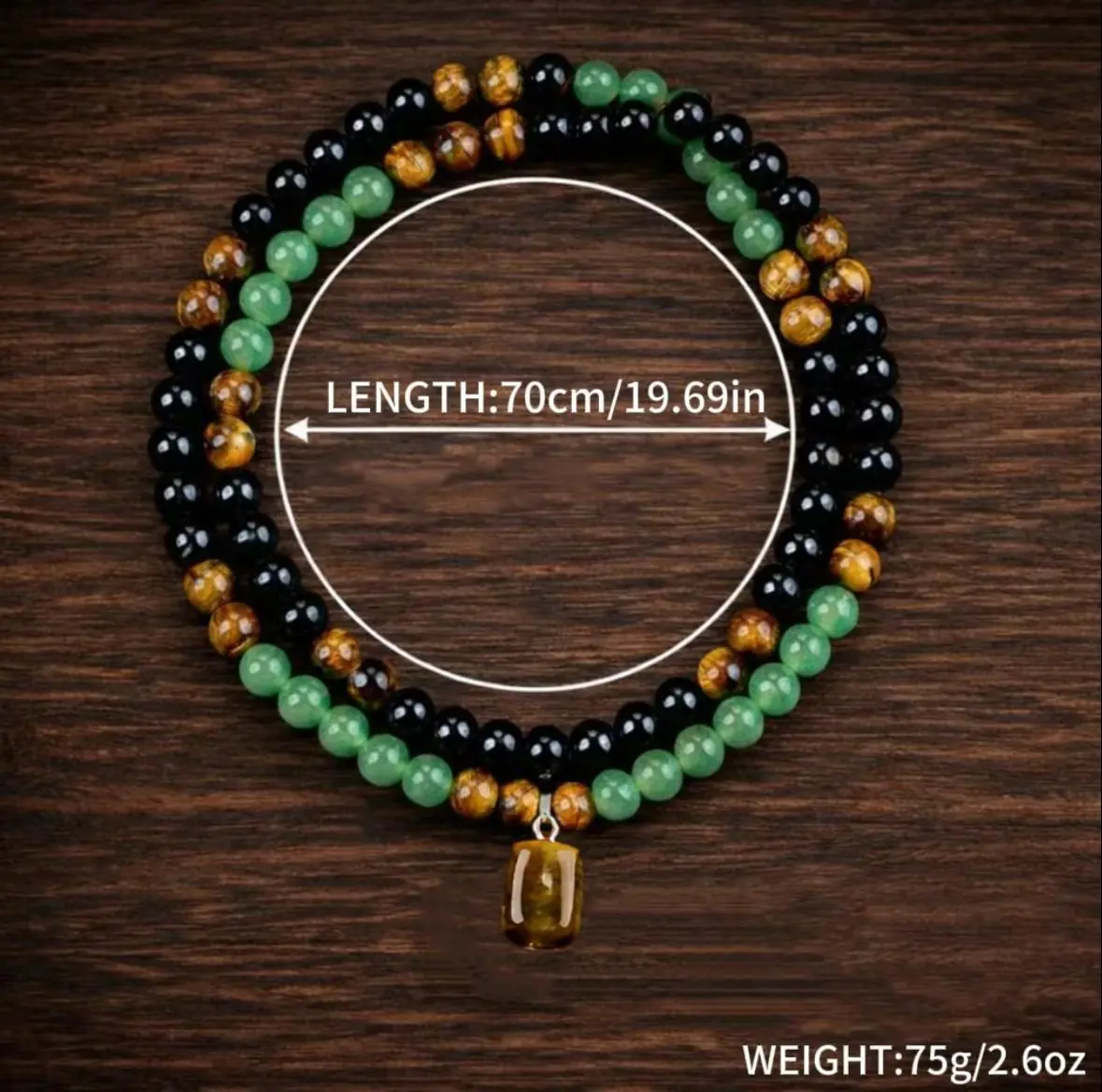 This set is versatile for daily casual looks, travel, festivals, and gift giving. Wear it solo or layer it to elevate your outfit. Pair it with a simple tee, hoodie, or sweater. Green Aventurine, Tiger Eye, and Black Obsidian create a balanced aesthetic. Enhance your streetwear outfits with this crystal-inspired jewelry.