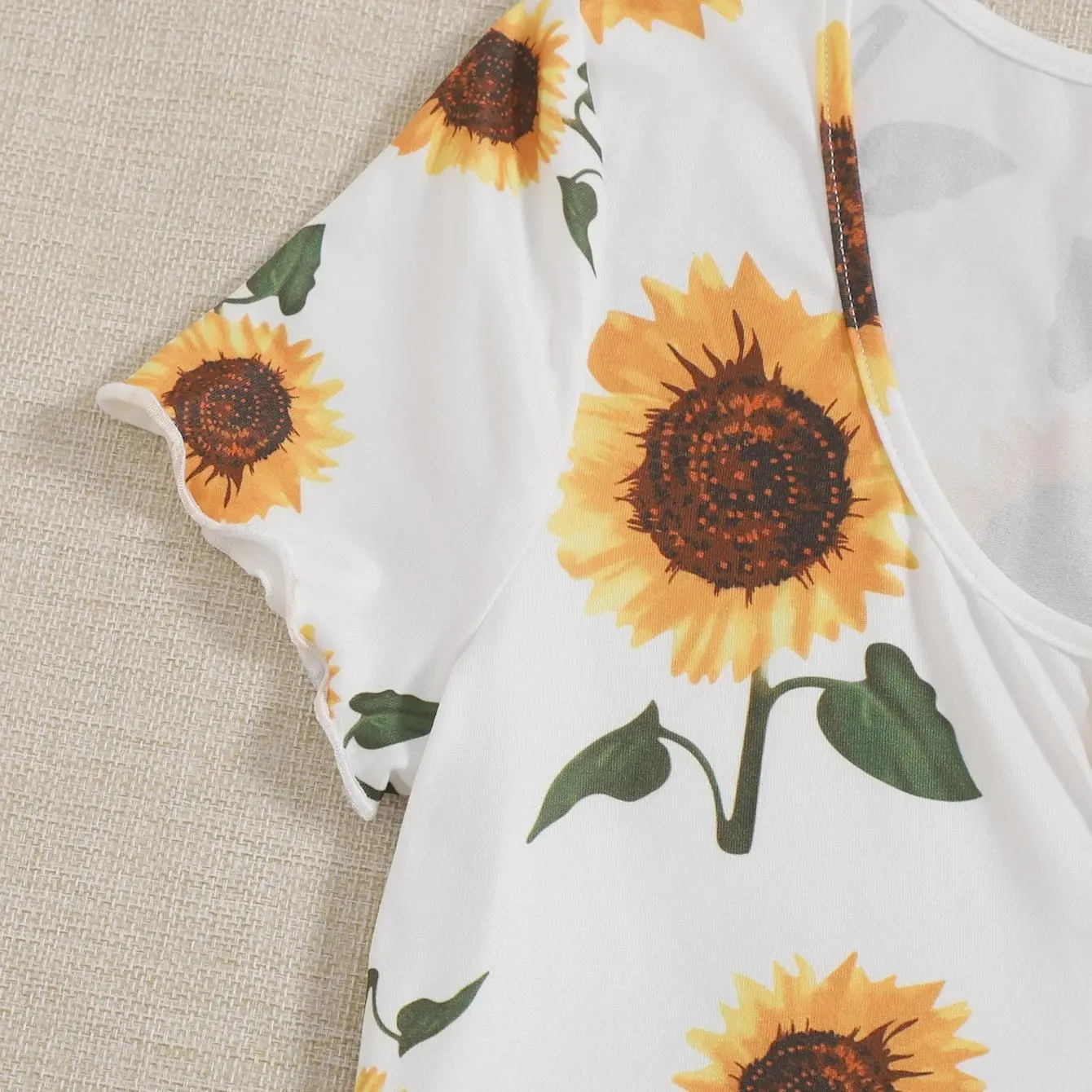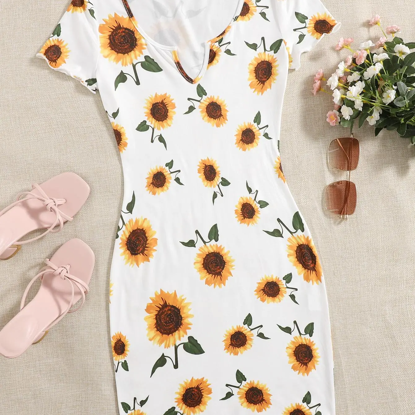 Sunflower Print Notch Neck Short Sleeve Bodycon Dress