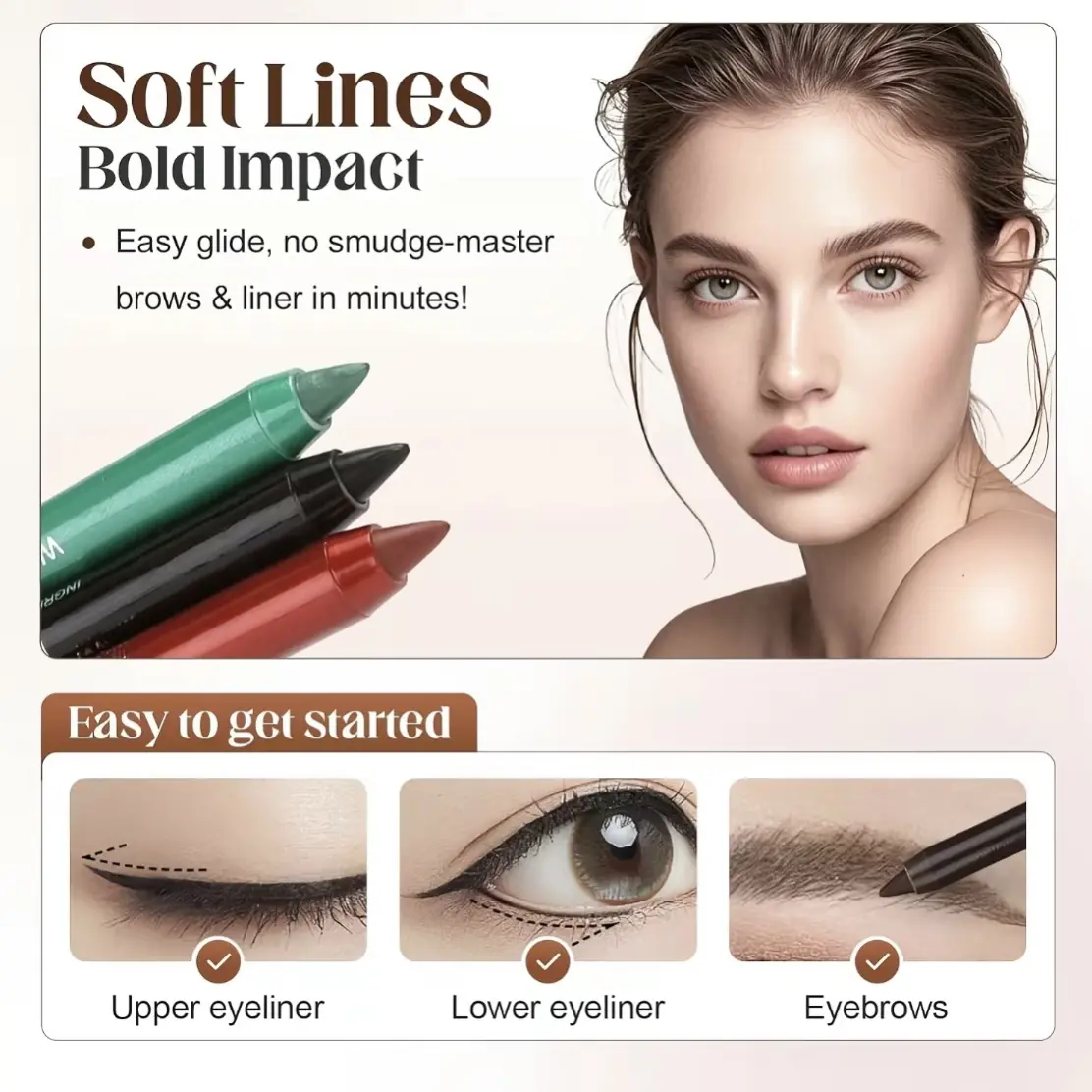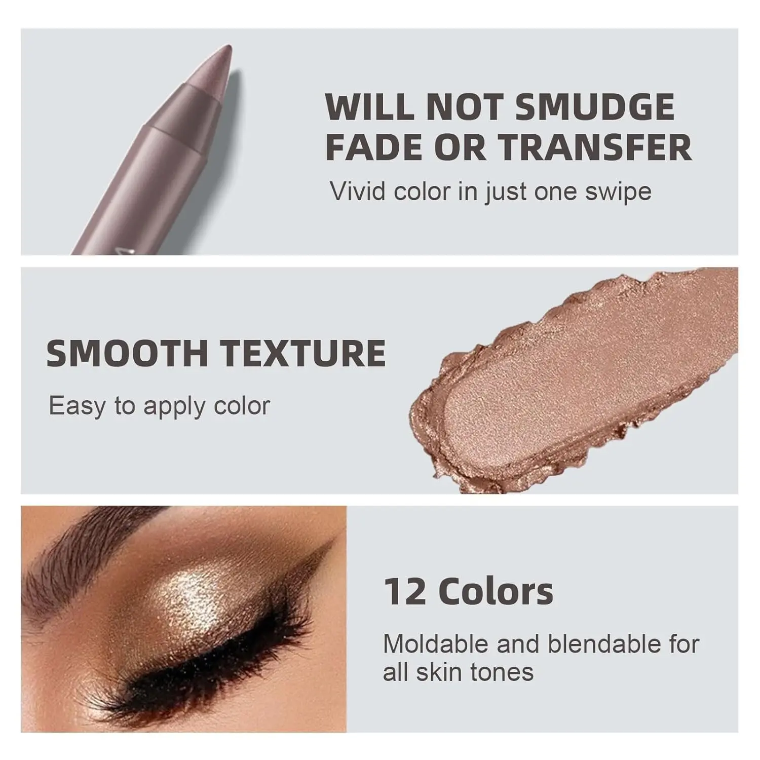 ·【SMOOTH & BEGINNER-FRIENDLY】The creamy, soft texture glides effortlessly across your lids, delivering precise, even lines that are easy to blend. The shimmer finish adds a luminous glow, and blending creates a natural, gradient smoky eye effect.
