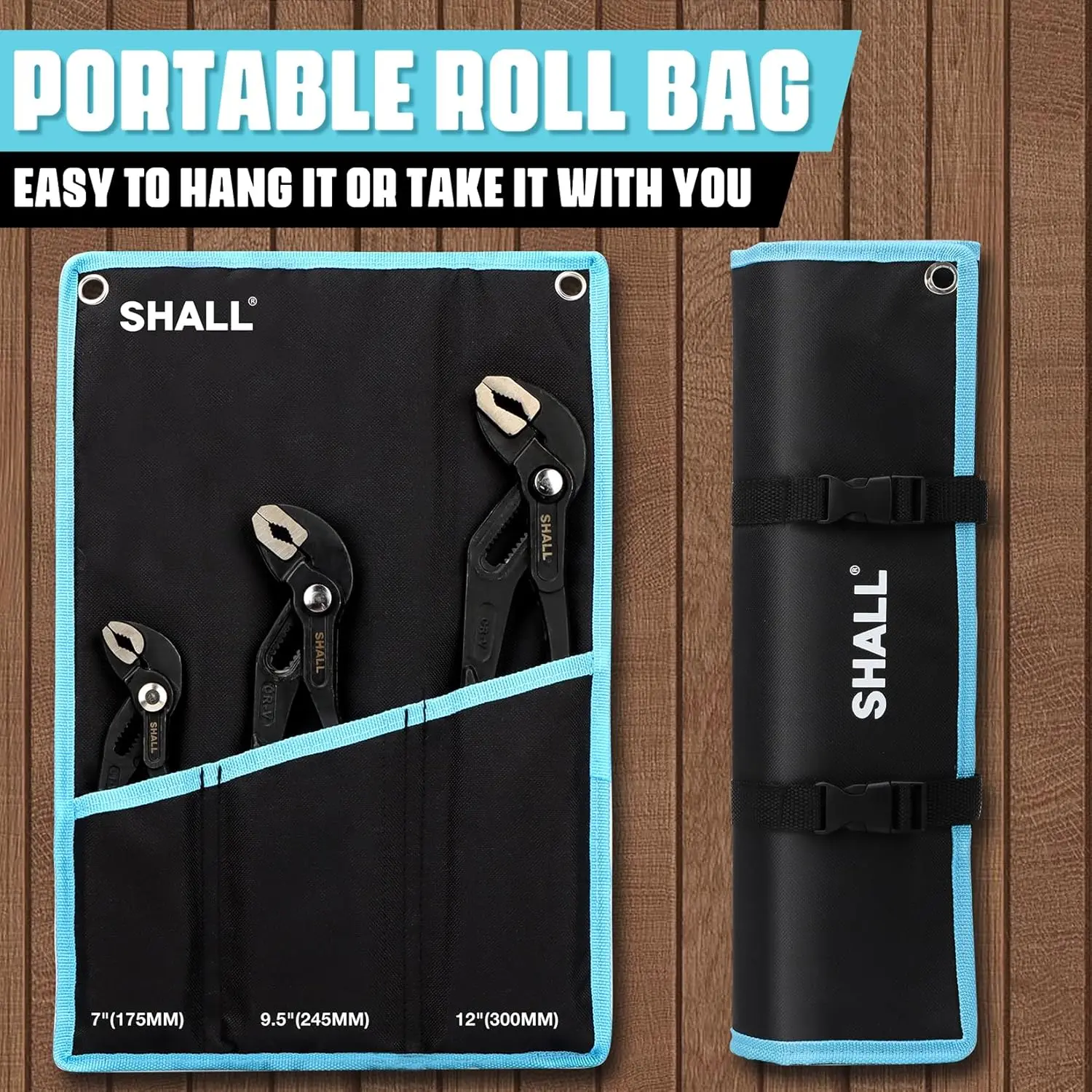 The roll bag with buckles can be rolled up for easy carrying or hung on the wall for tool organization
