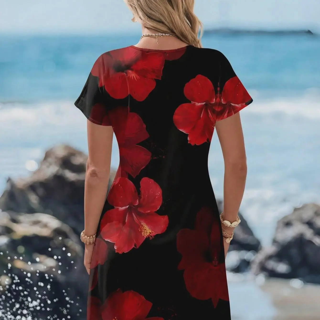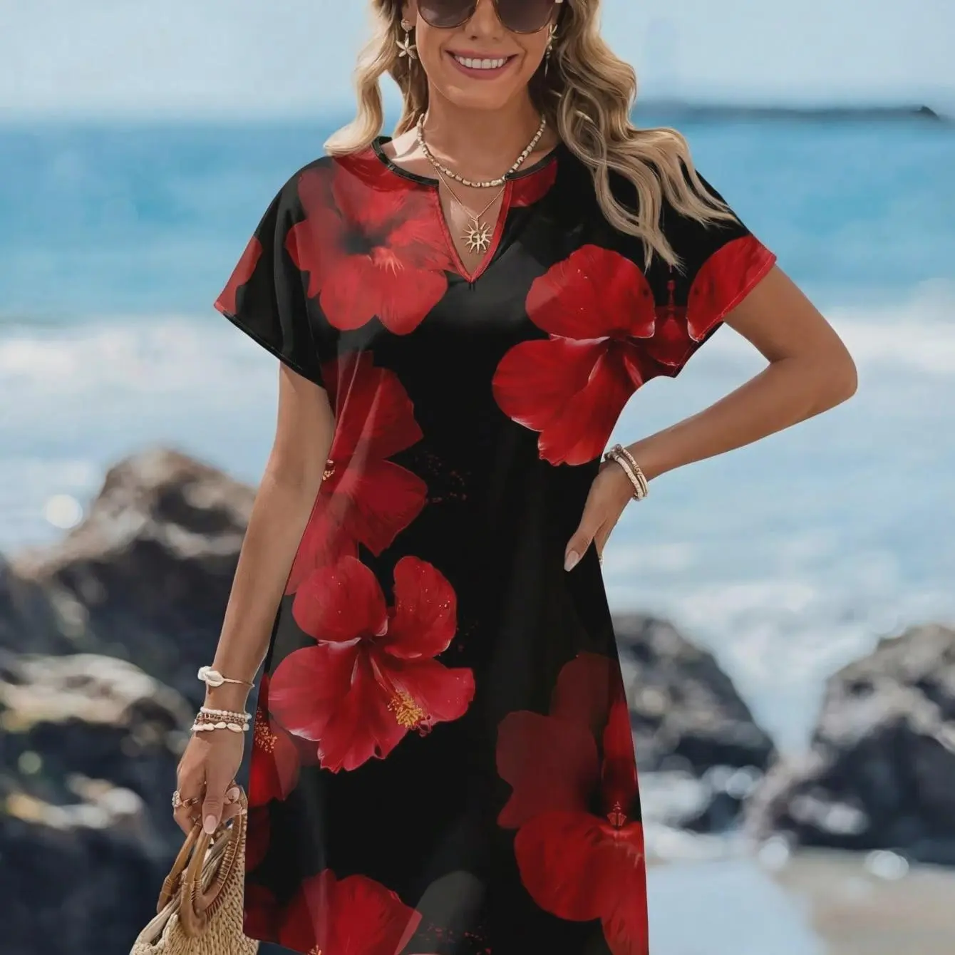 Women's V-Neck Floral Print Short Sleeve Casual Dress For Spring Summer Boho Beach Style