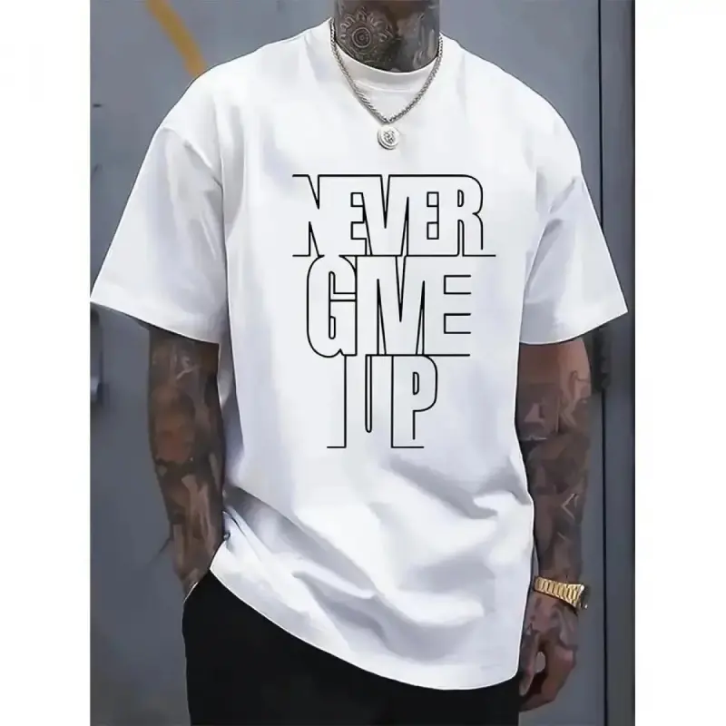 A Men'S Casual Cotton T-Shirt With The Words "Never Give Up" Printed On It - Crew Neck, Slight Elasticity, Knitted Fabric, Regular Version, Summer Short-Sleeved T-Shirt Suitable For Adults, Large Size Option Golf Gift T-Shirt For Men And Women