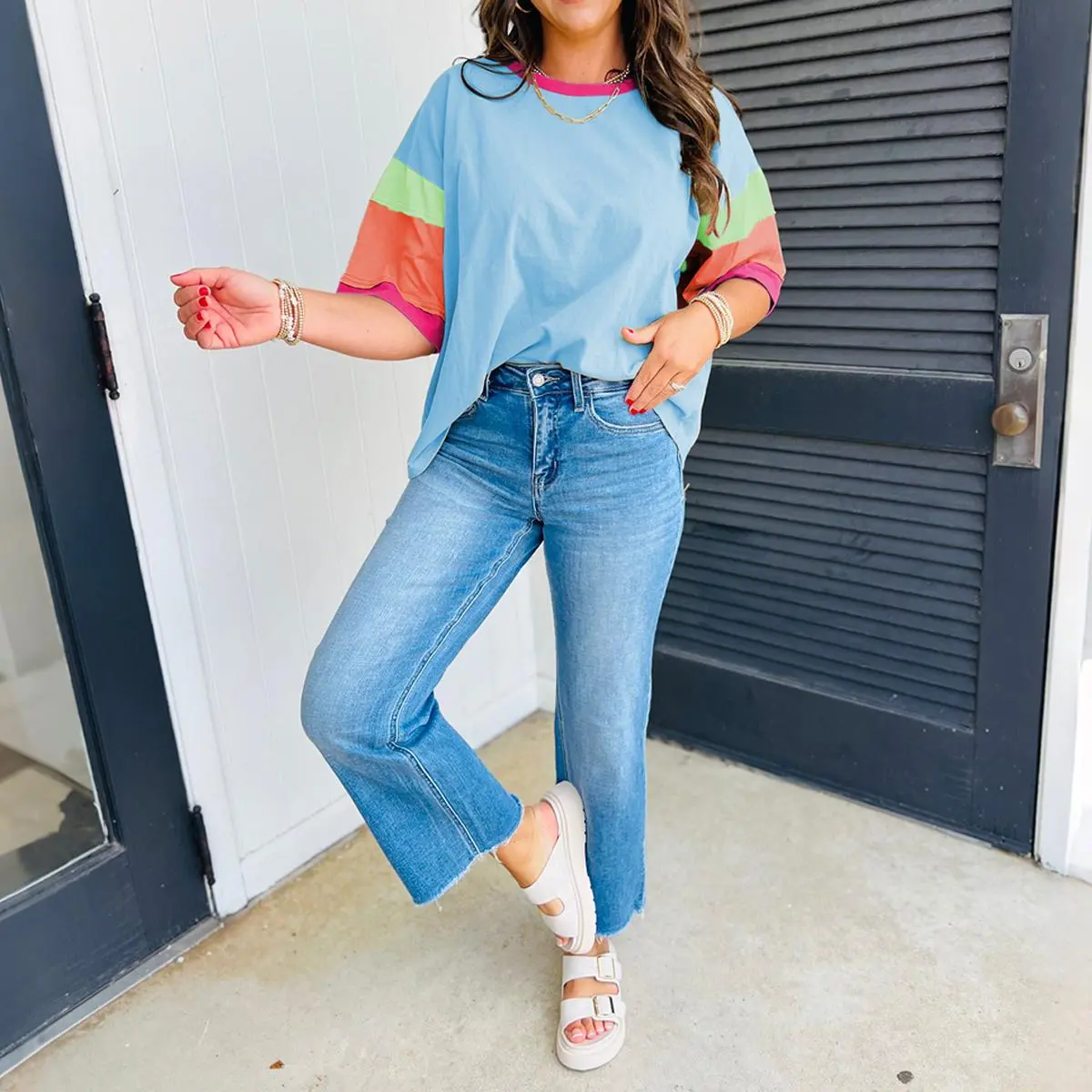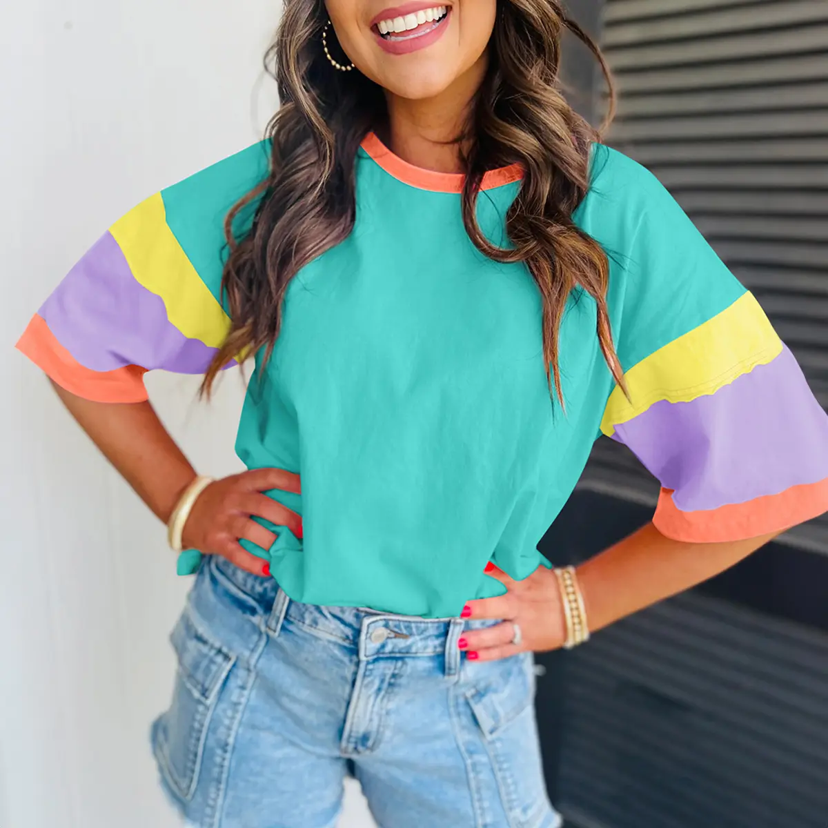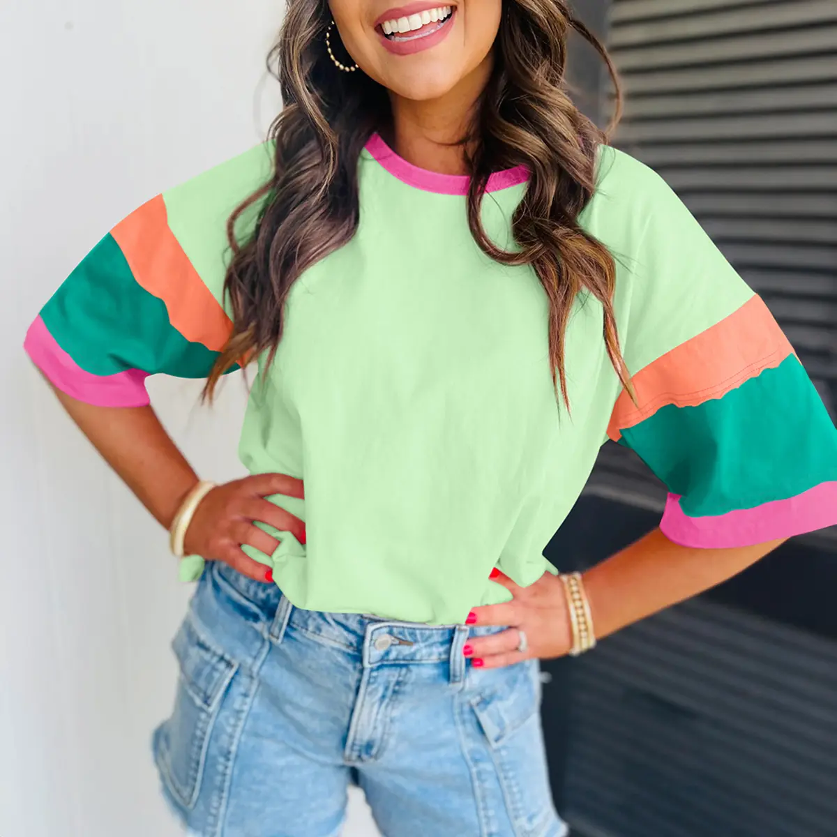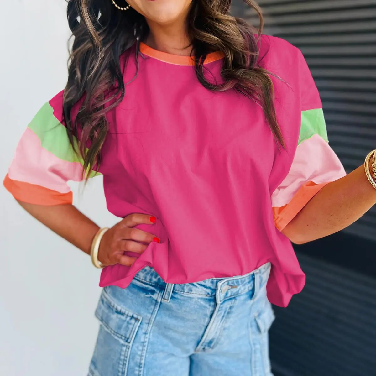 Color Block Stitching Sleeve Round Neck Oversize Top