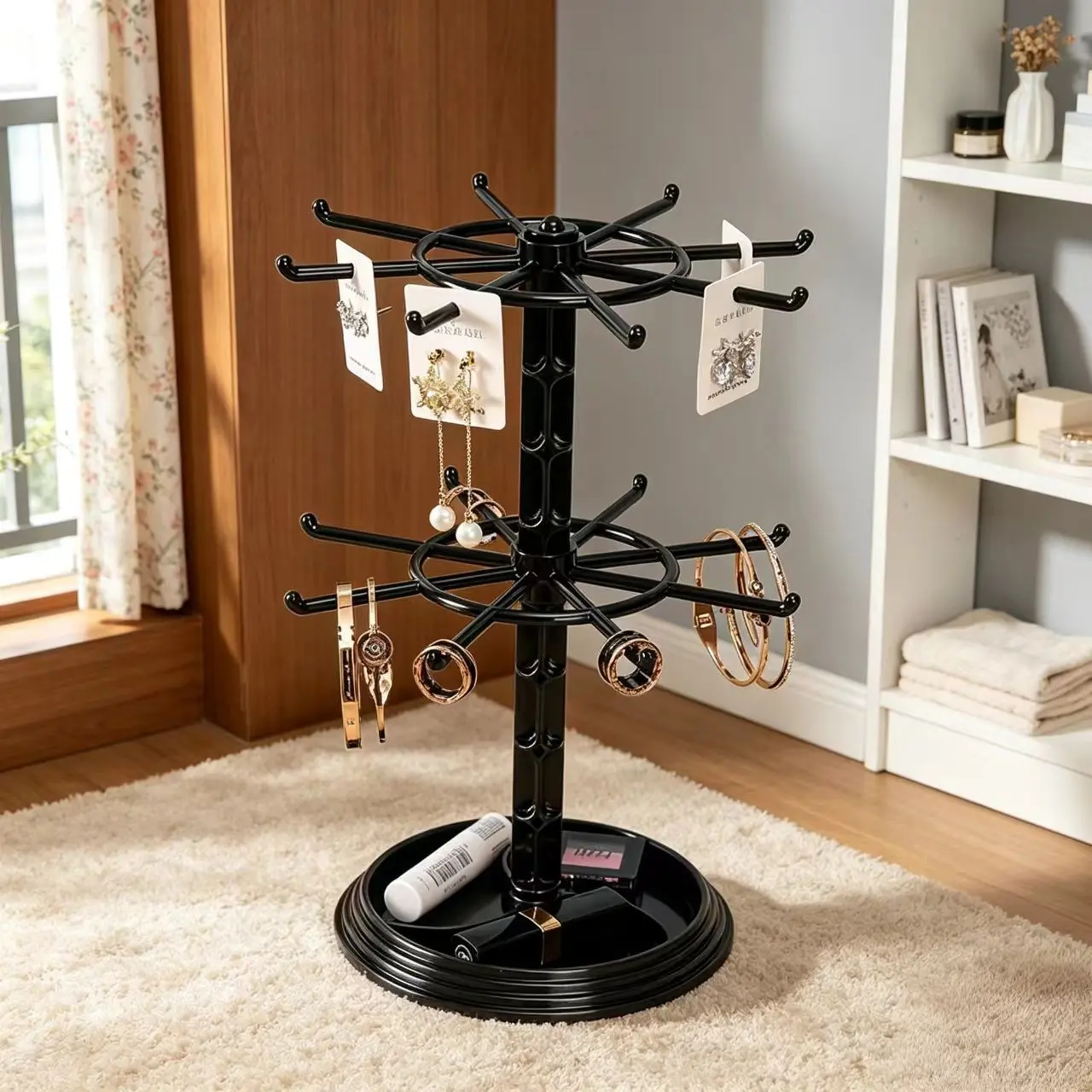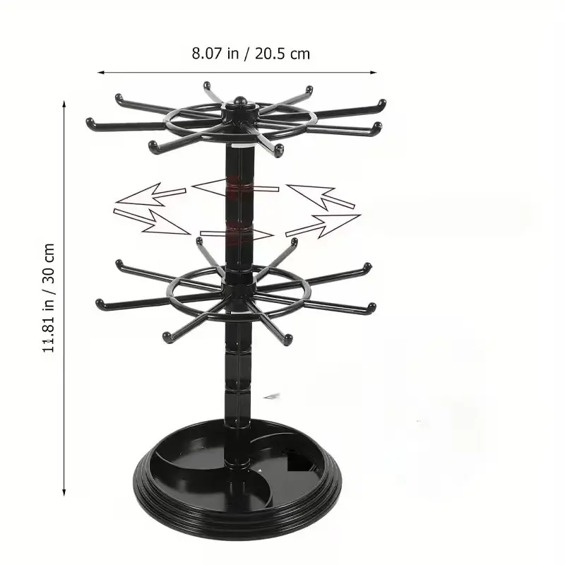 【Multi-functional】: Organize necklaces, bracelets, earrings, and keychains with ease using this rotating jewelry rack.