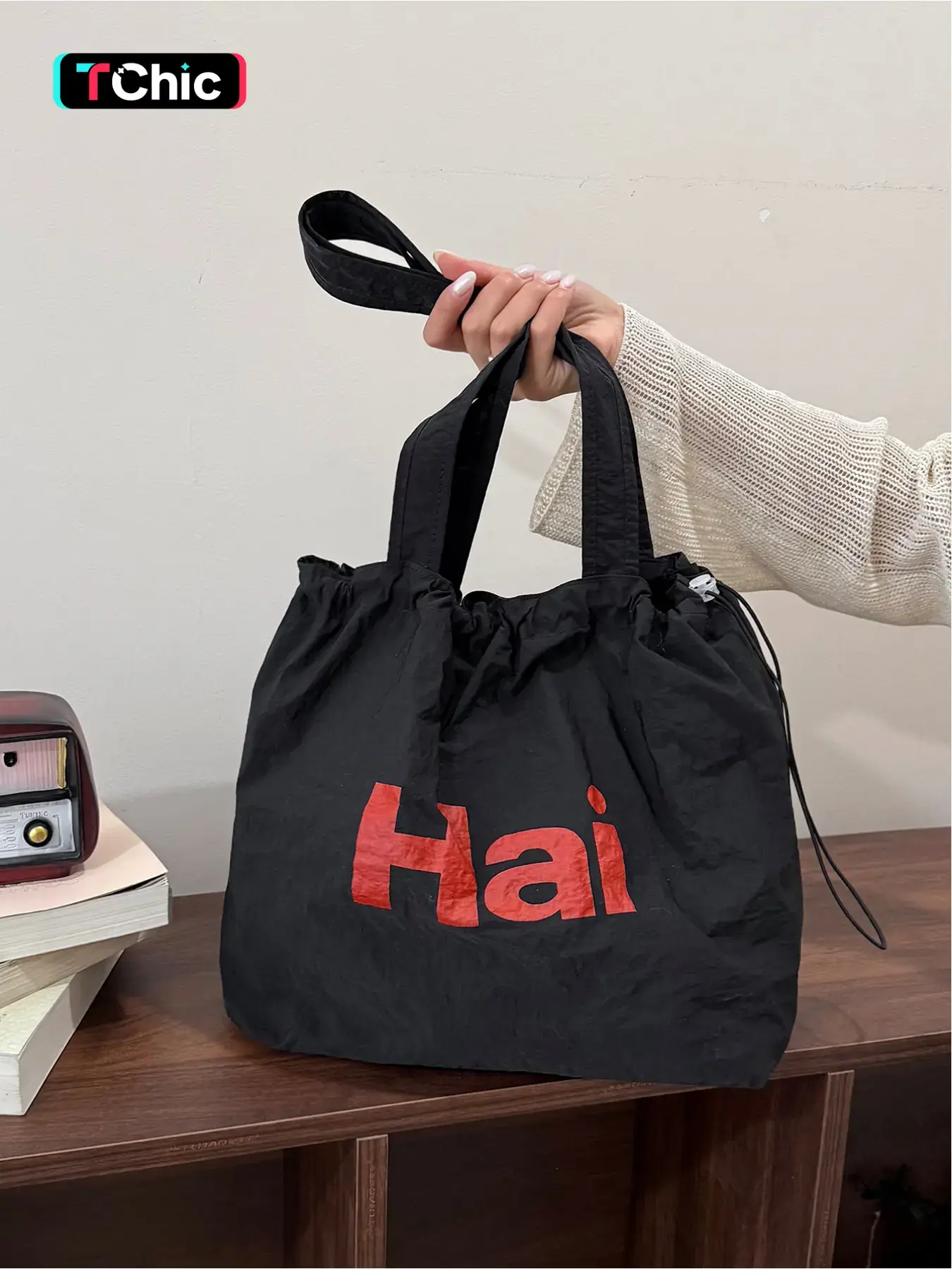 Large capacity drawstring tote bag with letters, simple casual shoulder bag, lightweight and comfortable, street style, work, shopping, underarm bag