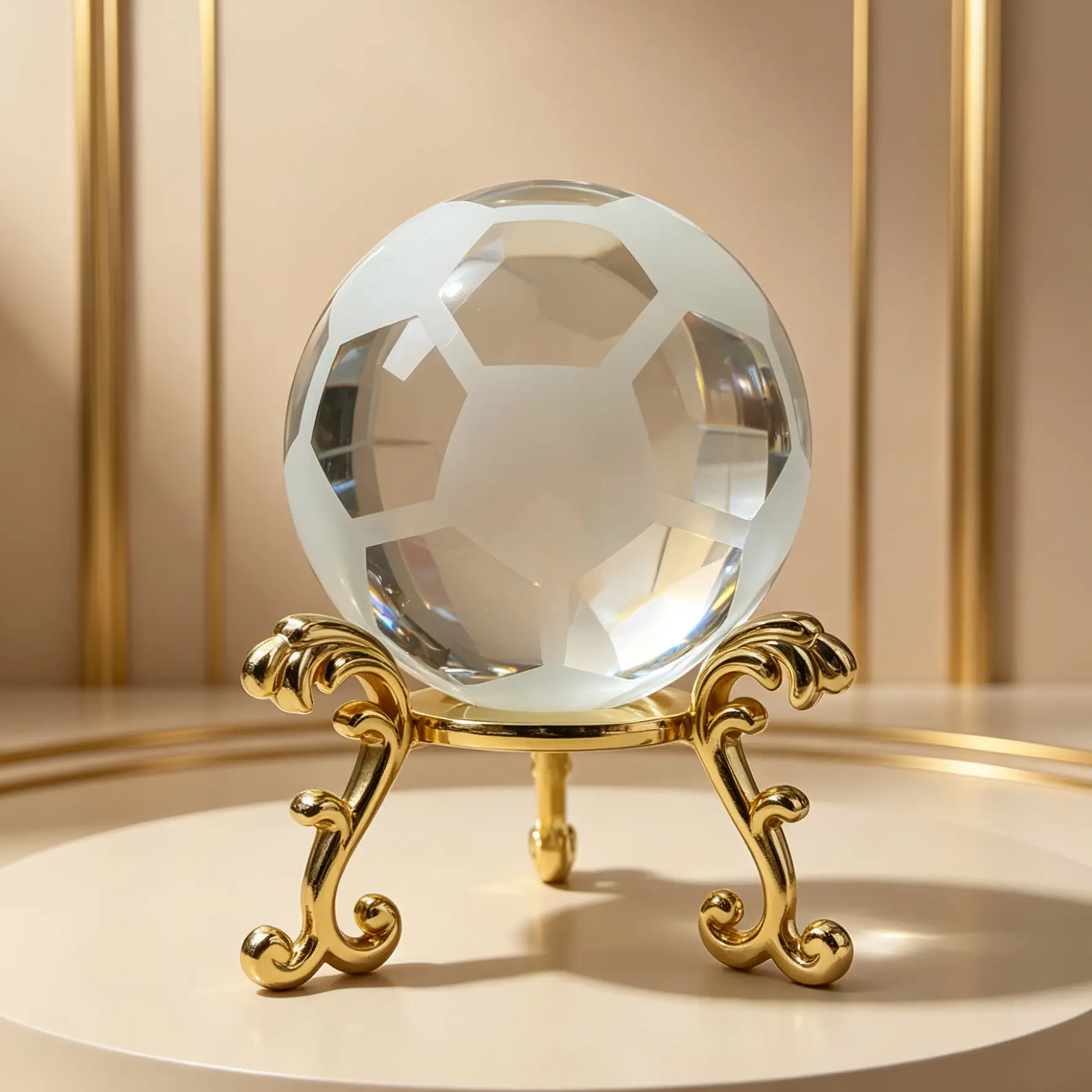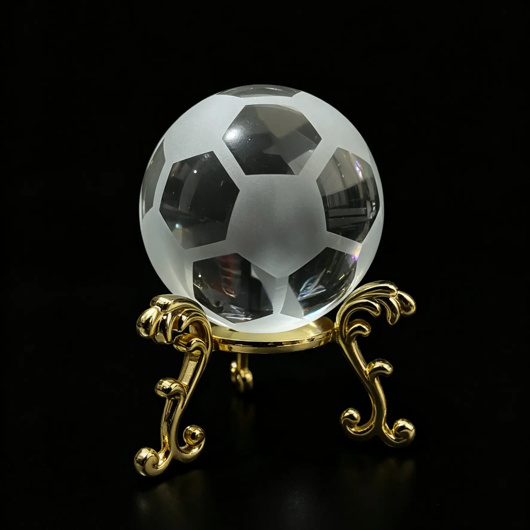 Where football culture meets retro elegance. We useTop-grade K9 glasswithPremium metal standThe gold embossed texture and the soccer ball’s geometric lines complement each other beautifully. It’s not just a decorative accent for the tabletop; it serves as a visual focal point that elevates the space’s luxurious feel, showcasing the owner’s refined taste.