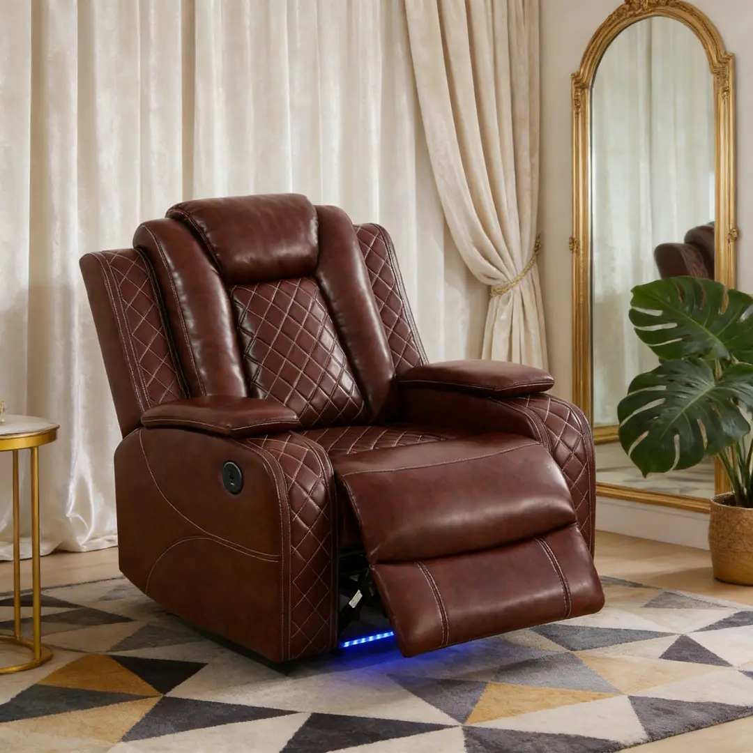 c. Upholstered in Red leather, with a smooth surface, delivering a strong sense of quality and luxury.d. The backrest can tilt back to 115-120° in the closed position and 160-180° when fully extended. The ergonomic structure is designed to enhance sitting comfort.