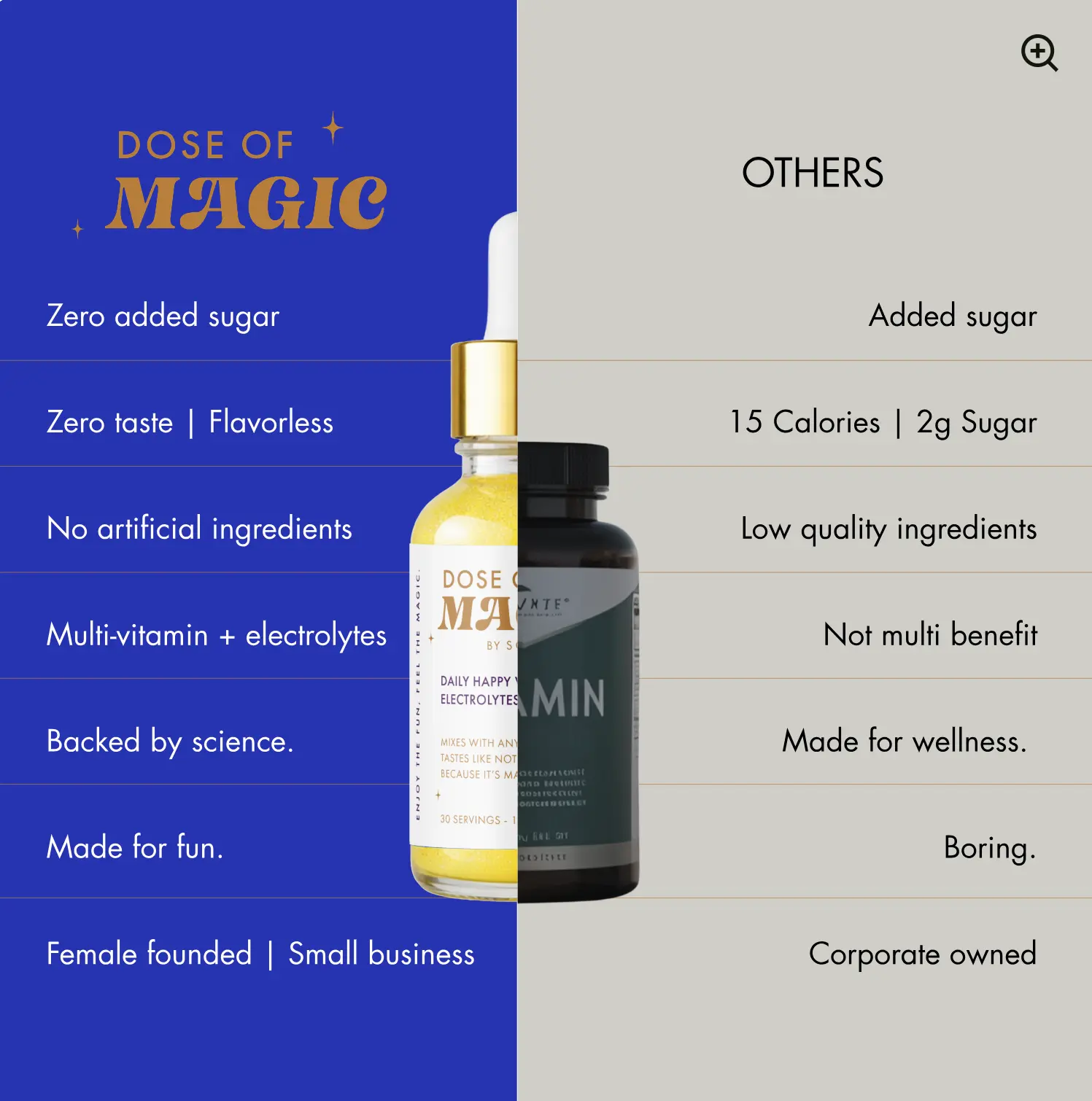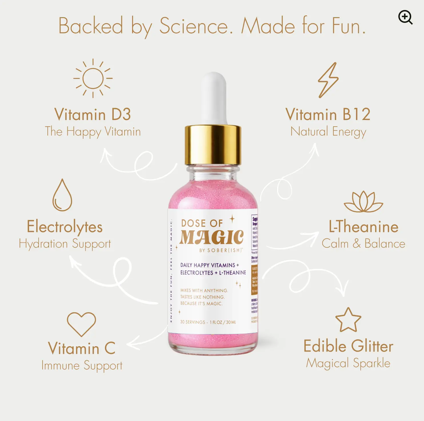 Dose of Magic Drops are a flavorless liquid multivitamin with electrolytes and L-Theanine designed to support energy, hydration, and calm focus. Just add one dropper to any drink—water, soda, juice, or mocktails—and enjoy your daily dose of wellness.
