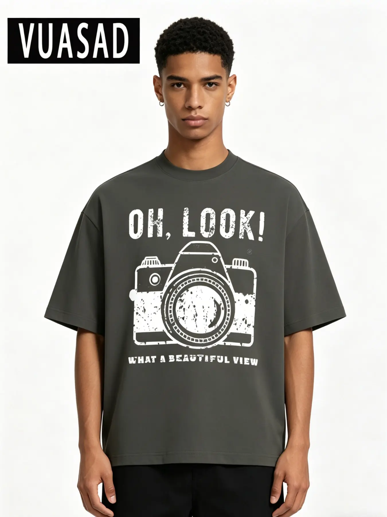5. Men's Vintage Camera Pattern Cotton T-Shirt, American Retro Street Style, Casual Loose-Fitting Short Sleeve Top, Long Length
