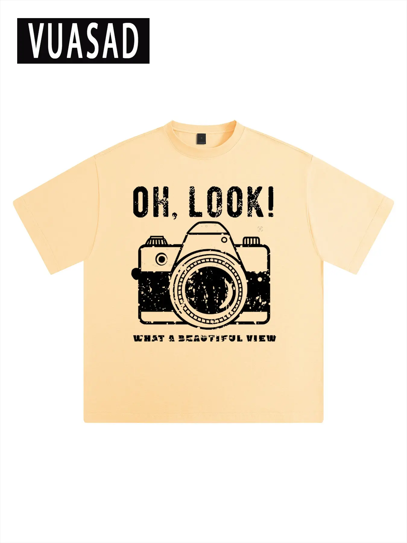 Men's Vintage Camera Pattern Cotton T-Shirt, American Retro Street Style, Casual Loose-Fitting Short Sleeve Top, Long Length