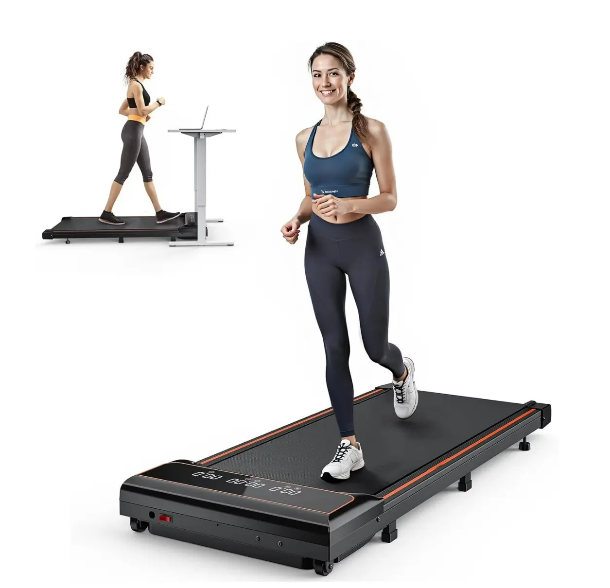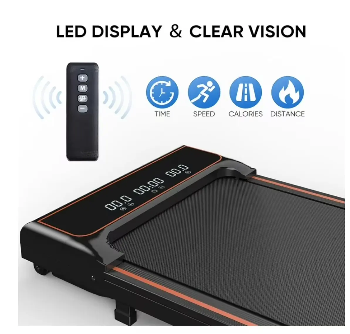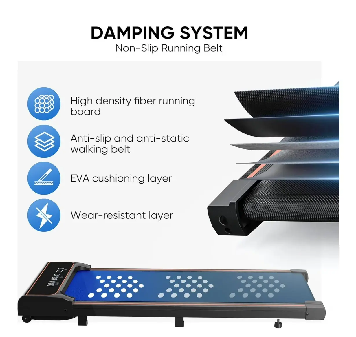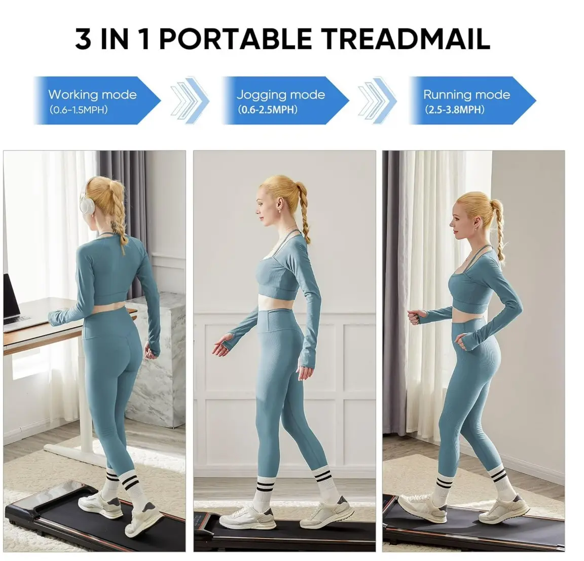 2-in-1 Mode Under Desk Treadmill, a versatile fitness solution for both work and exercise. With speeds ranging from 0.5 to 3.8 MPH, it can be used as an under desk walking treadmill for multitasking or as a running treadmill to achieve your fitness goals. The 45.28"D x 19.29"W x 4.72"H walking area provides a comfortable experience, while the 5-layer non-slip running belt offers cushioning and safety for your knees and muscles. Made with a heavy-duty steel frame, it supports users up to 265lbs. The 2.5 HP powerful quiet motor ensures a smooth workout. The LED display tracks time, calorie, speed, and distance, while the remote control enhances safety by allowing instant speed adjustment and stopping. The space-saving design and transport wheels make it easy to move and store, perfect for home or office use. We offer high-quality customer service, including free replacement parts for any defects and prompt assistance with any inquiries.