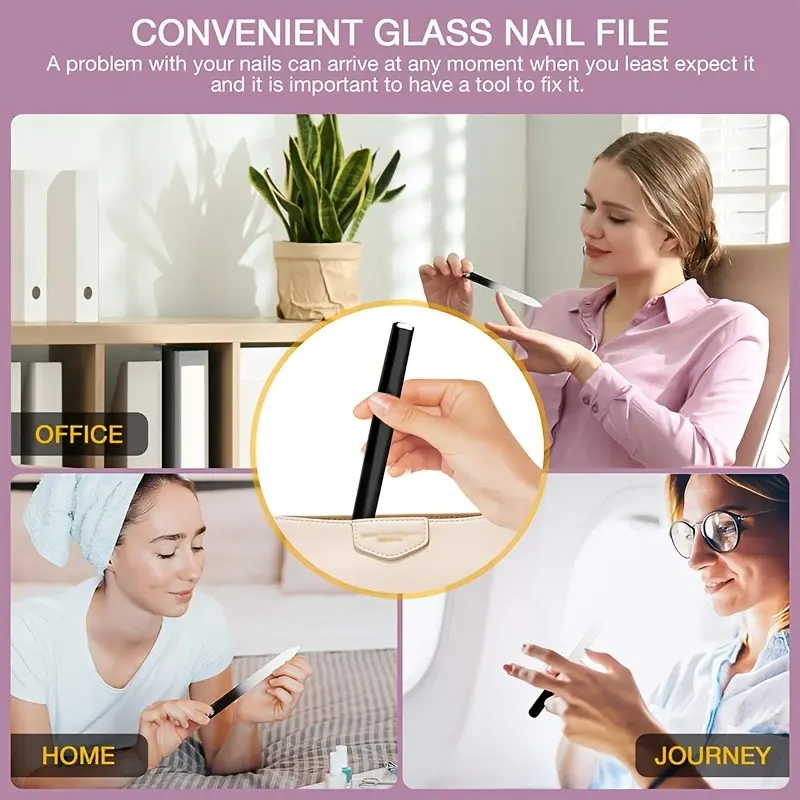·Professional glass nail file with premium storage case, available in red, black, and light wash blue, for salon-quality nail shaping and smoothing at home.