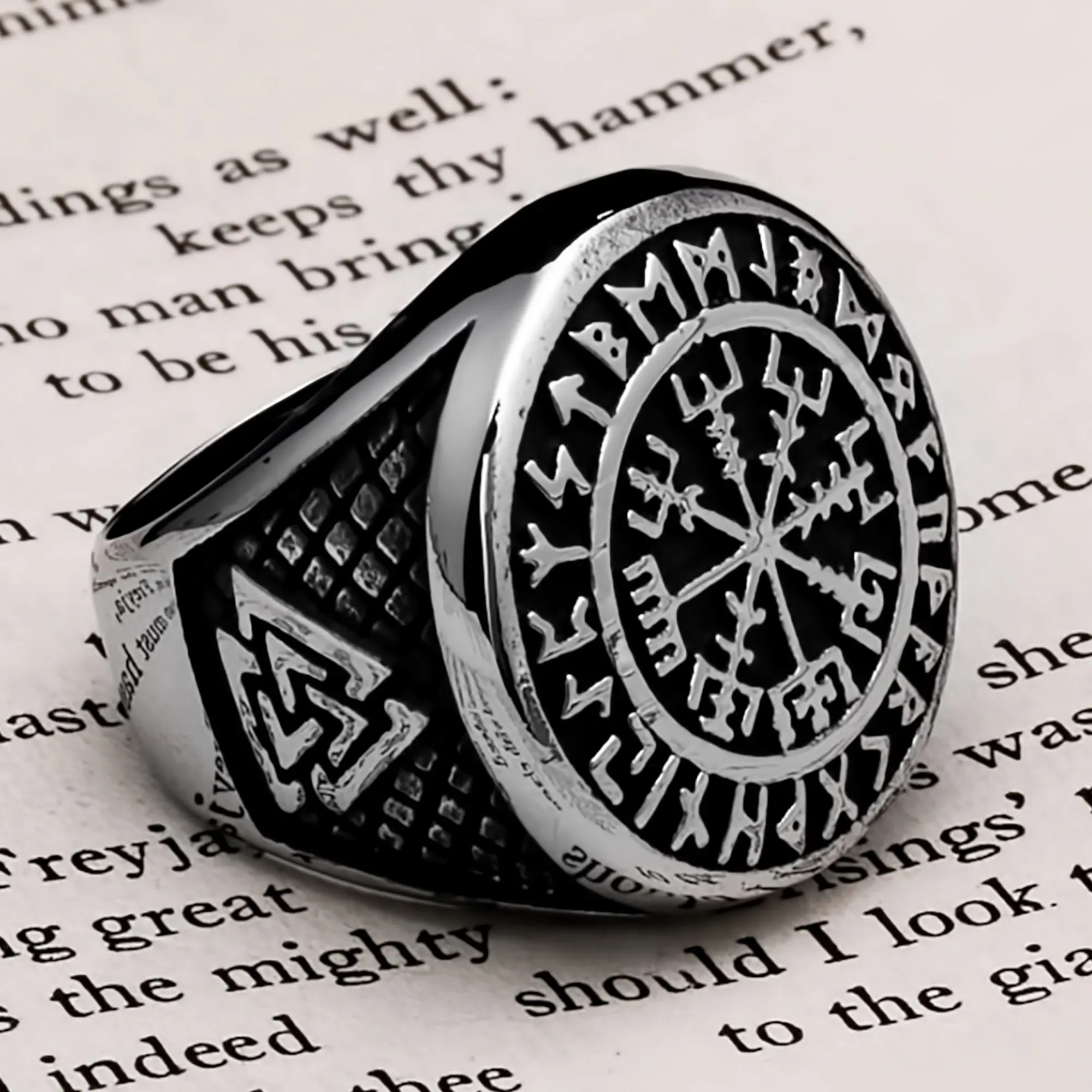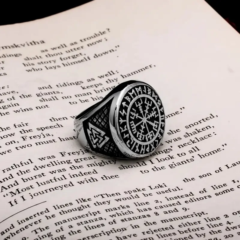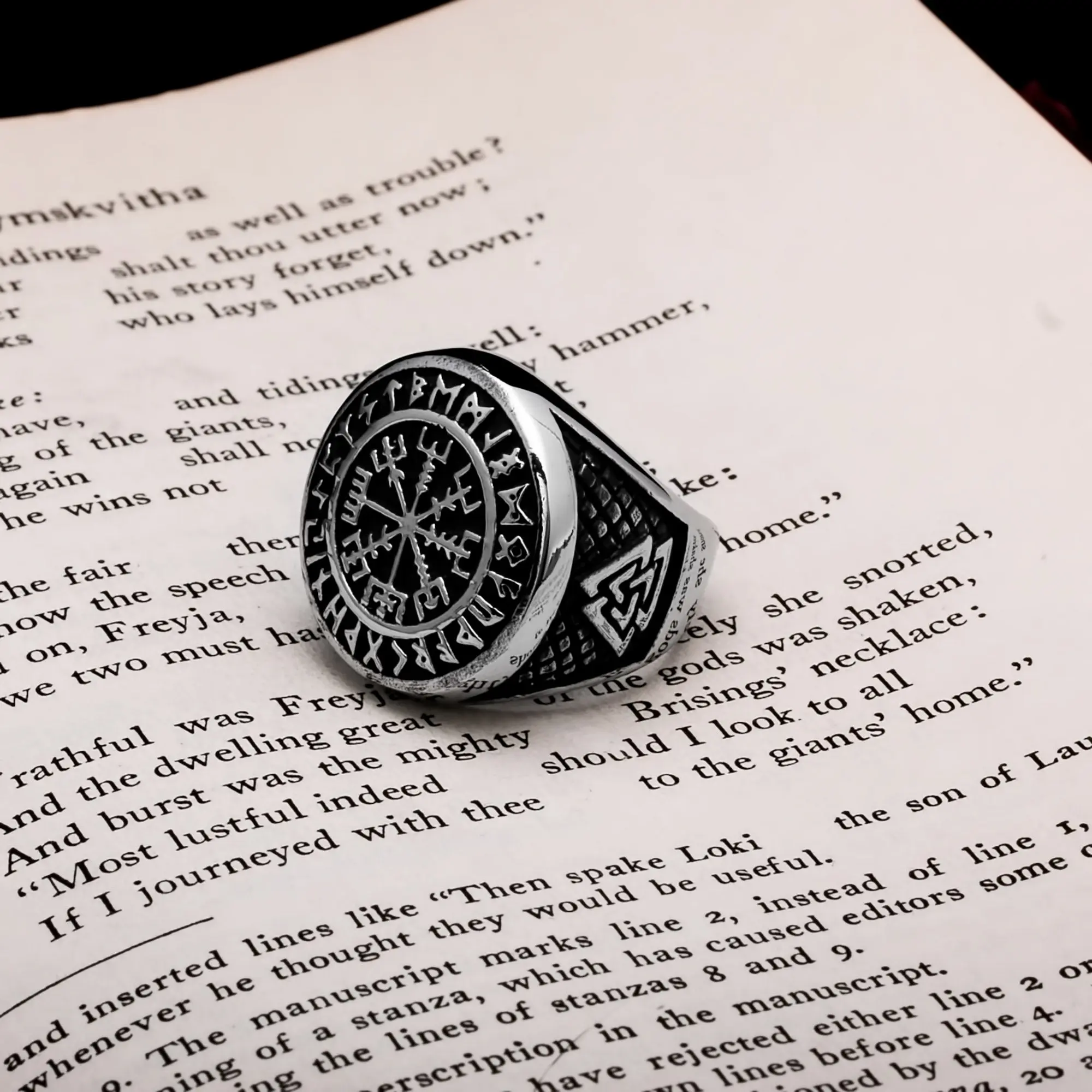 This ring features a stunning Vegvisir, Viking Compass, on the face of the ring encircled with the Elder Futhark Runes and the Valknut Slain Warrior Knot on both sides.