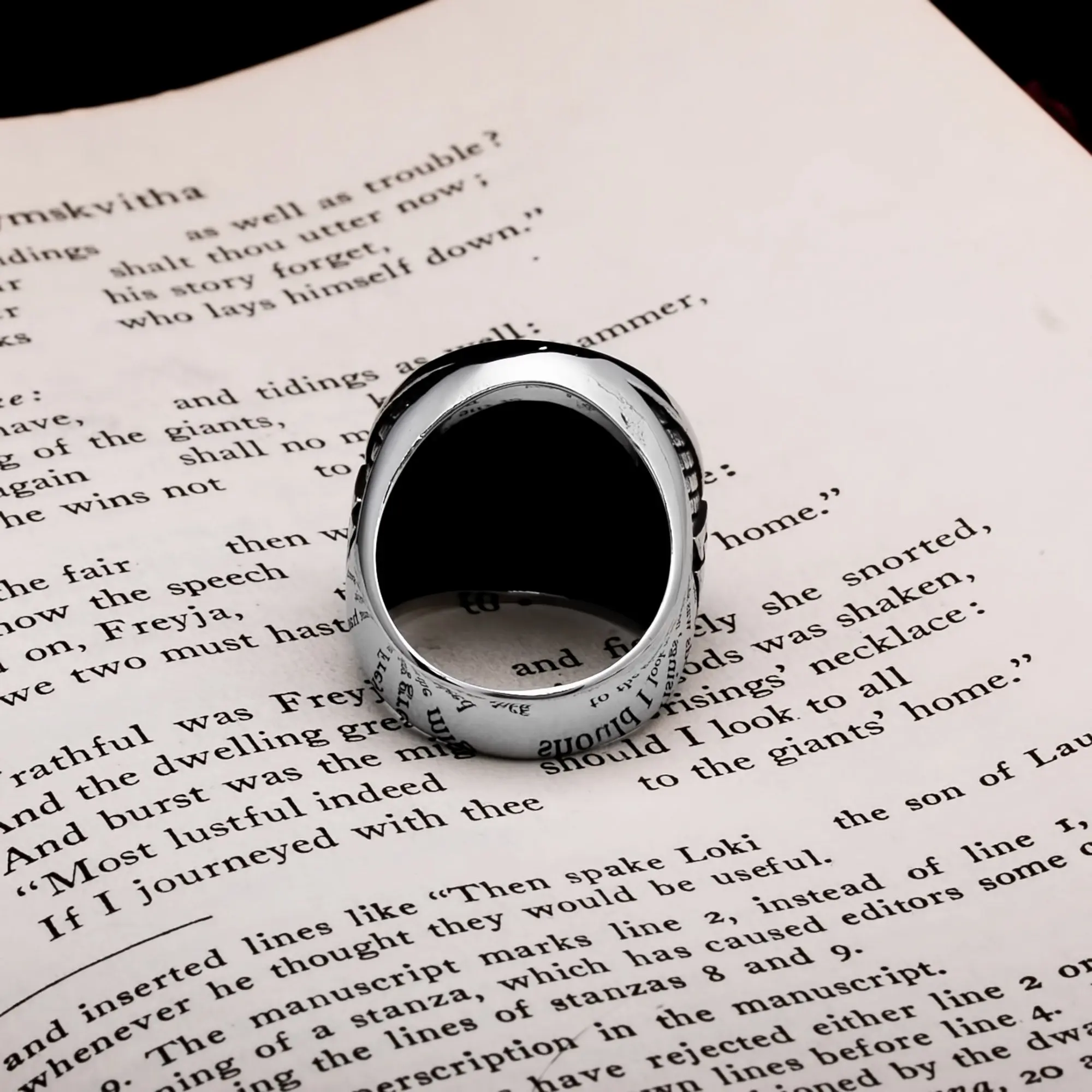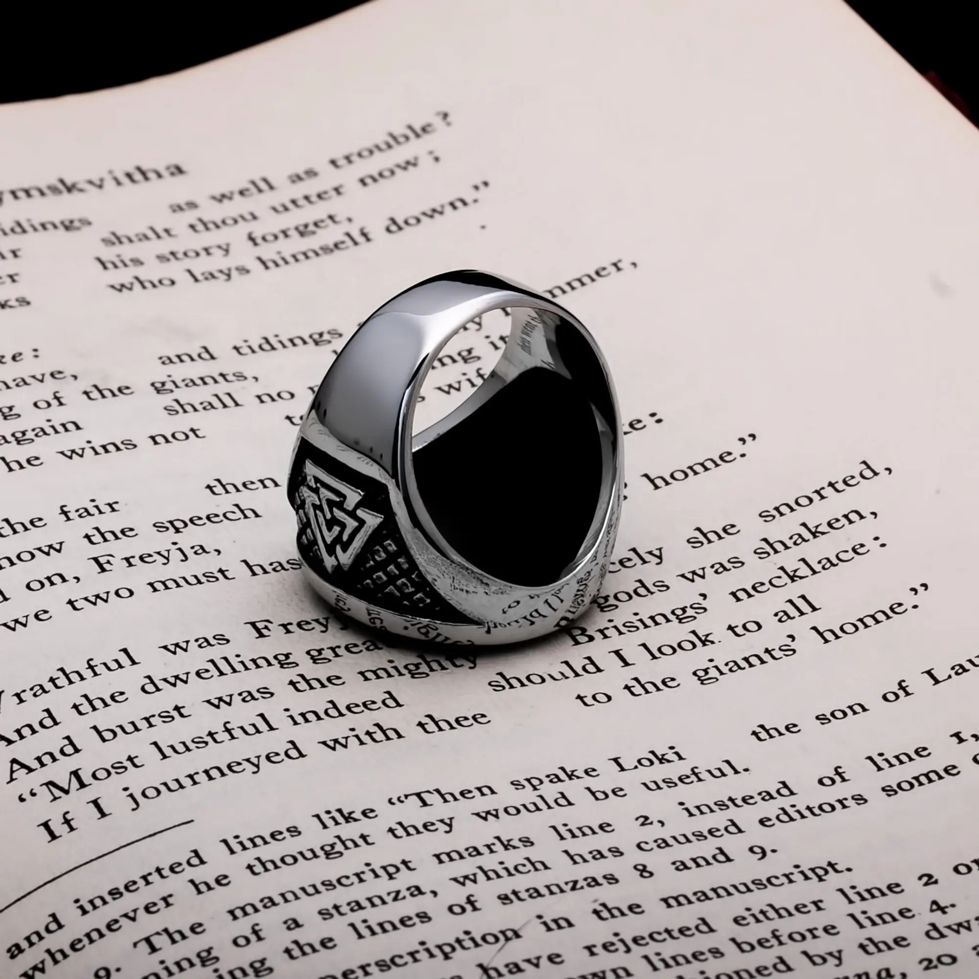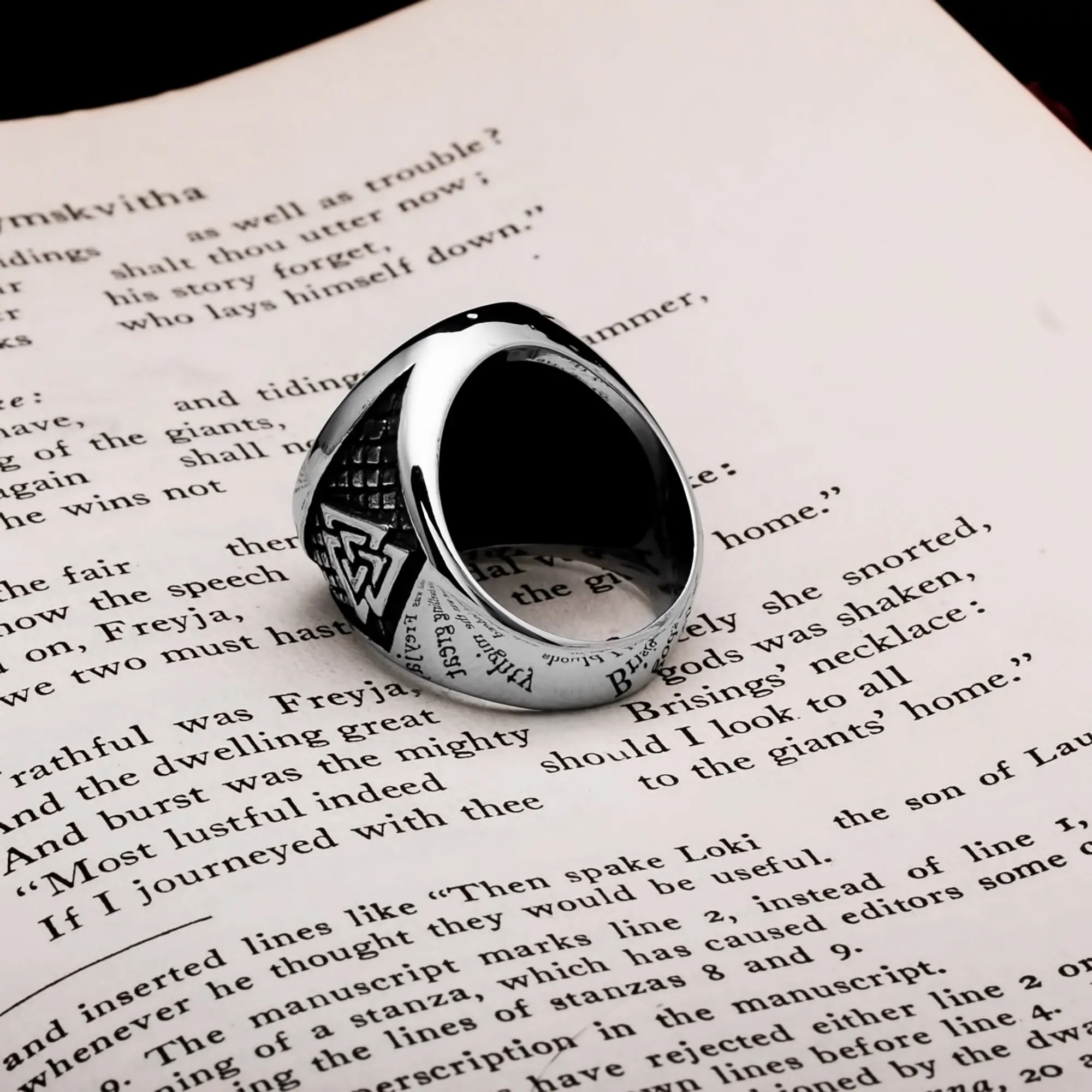 This ring features a stunning Vegvisir, Viking Compass, on the face of the ring encircled with the Elder Futhark Runes and the Valknut Slain Warrior Knot on both sides.