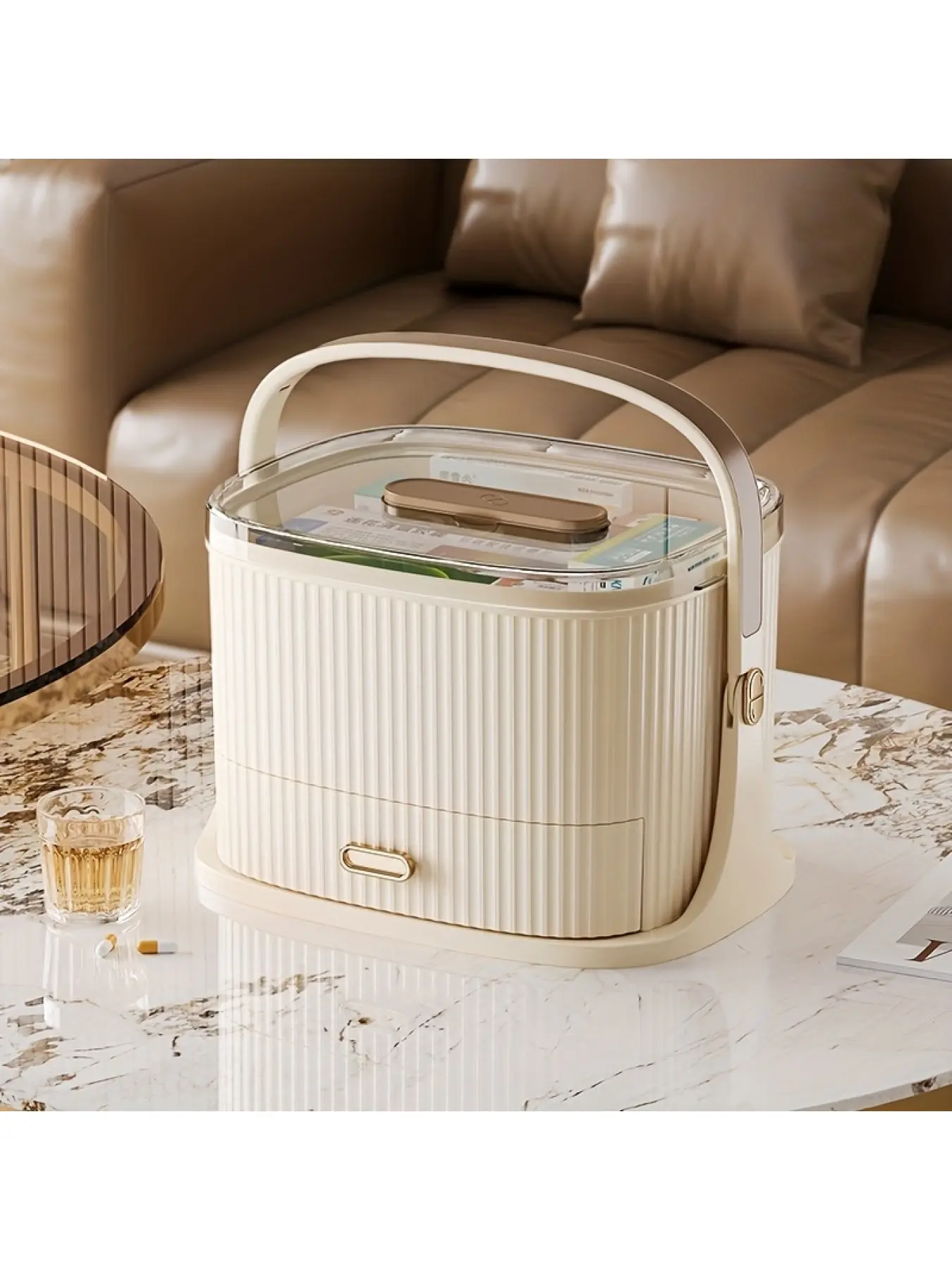 Large Size Leak-Proof Semi-Enclosed Cat Litter Box, Portable & Easy to Clean, Raised Edge, Lightweight & Durable, Modern White with Brown Accent, Large Capacity Cat Litter Pan with Sturdy Handle