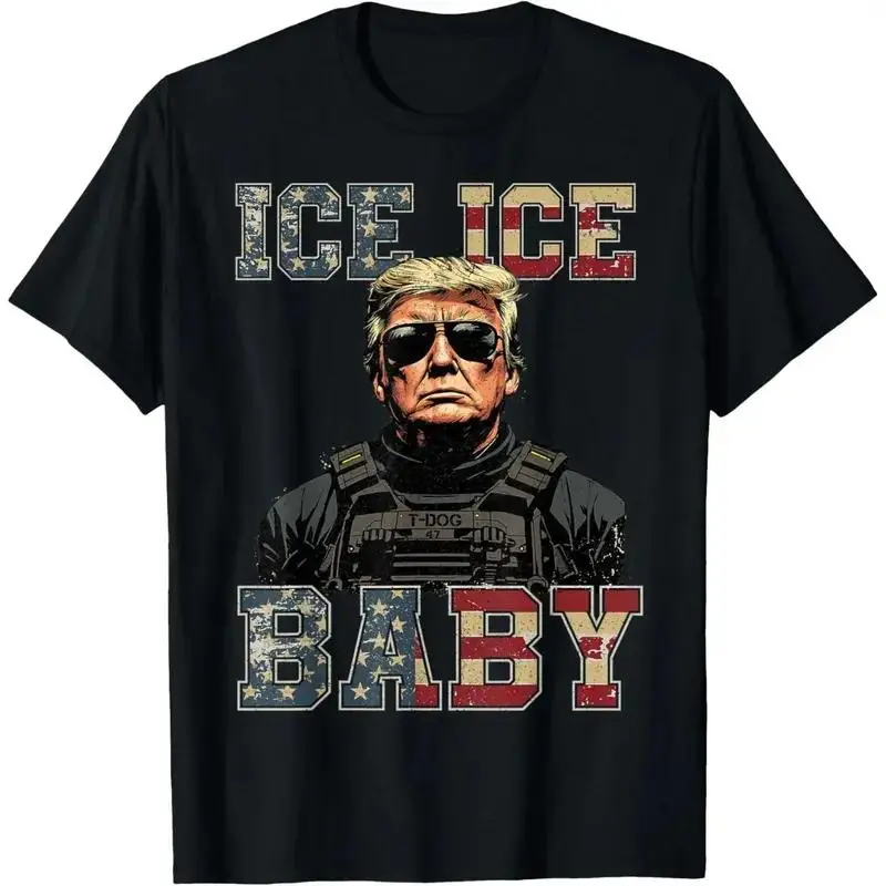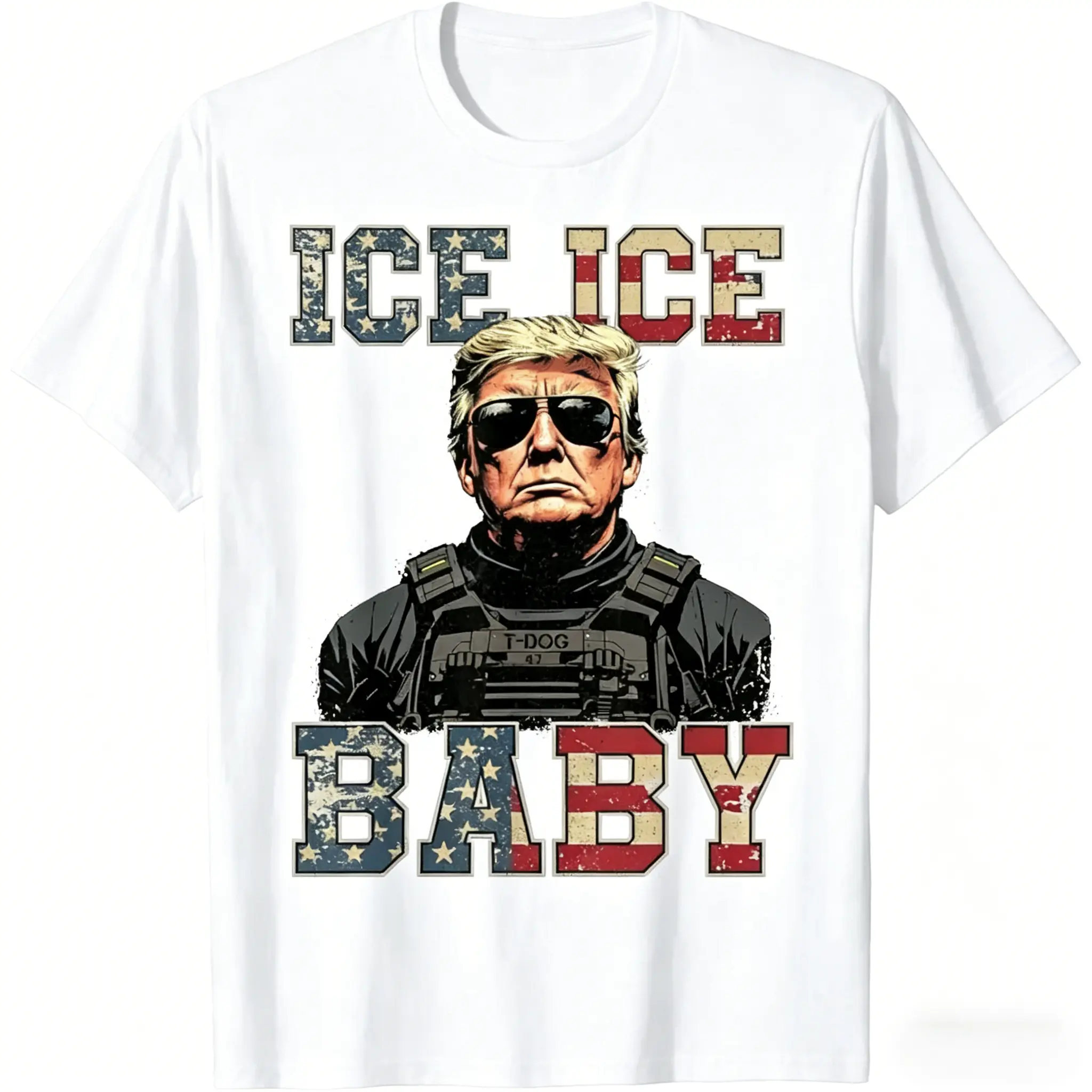 This vintage-inspired T-shirt is a fun addition to your summer wardrobe. It features a playful "Ice Ice Baby" design with a humorous Trump twist. Ideal for casual outings, this crewneck top is perfect for women who love streetwear. The short sleeves make it a comfortable choice for warm weather.