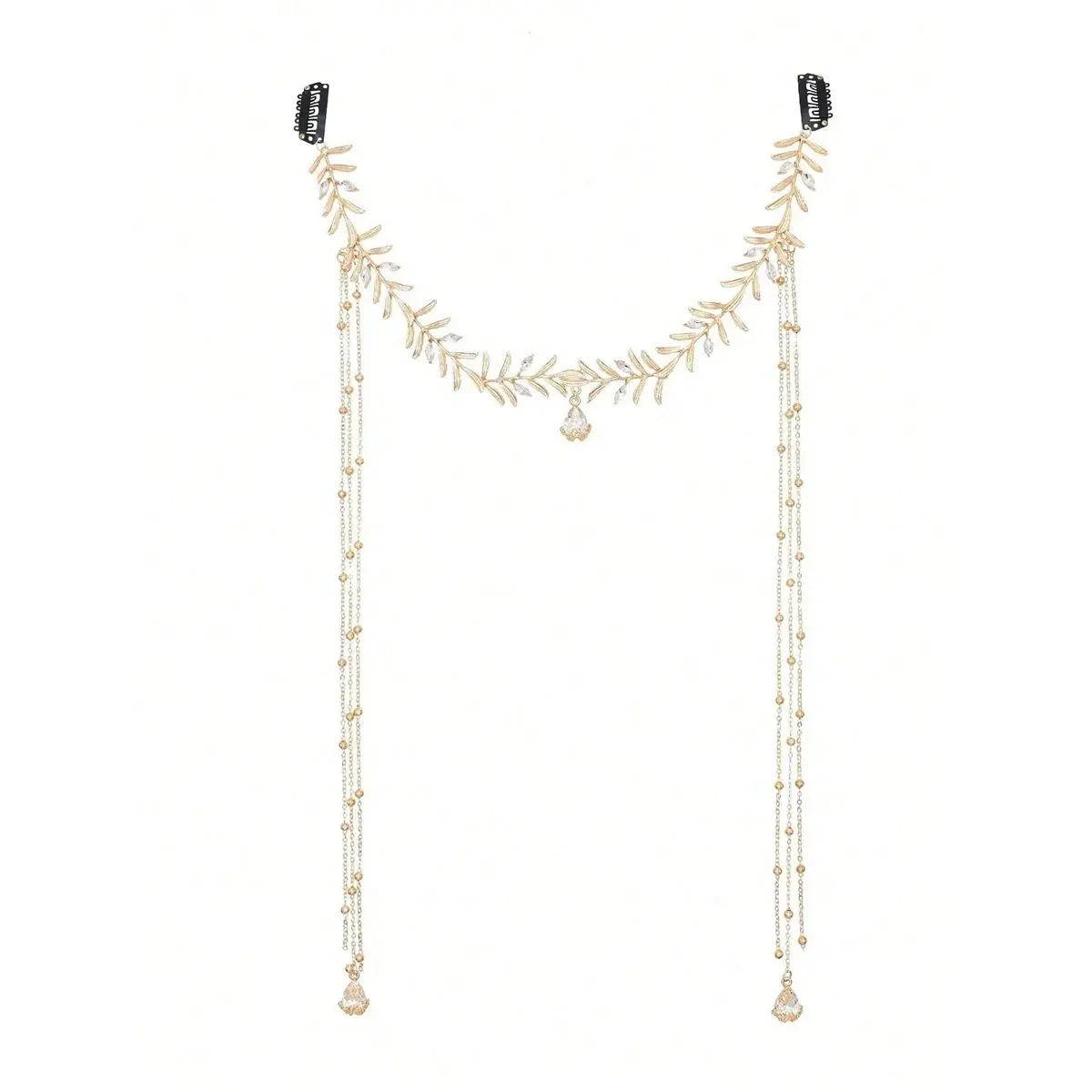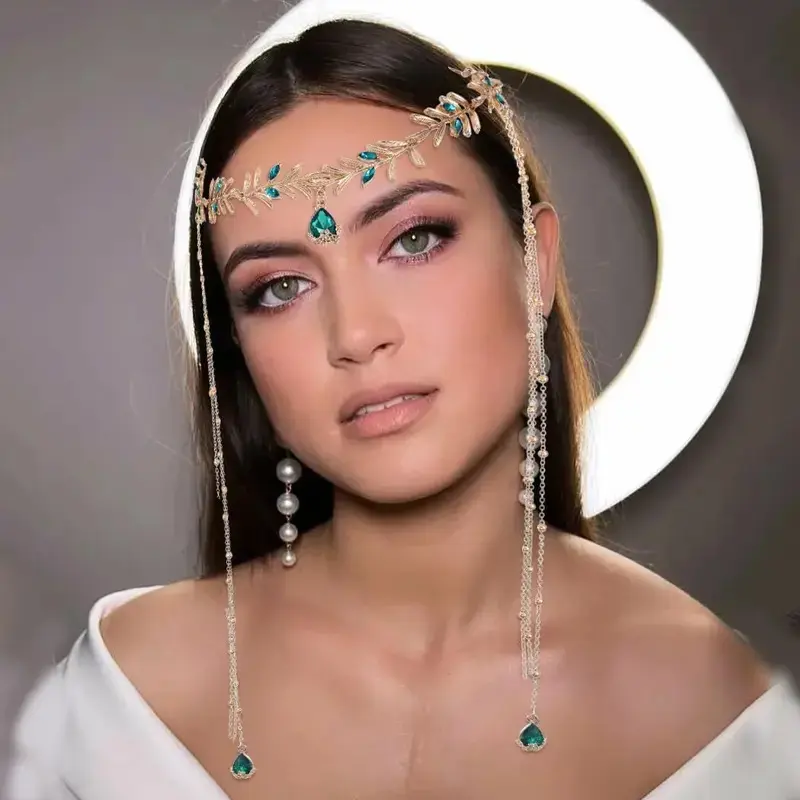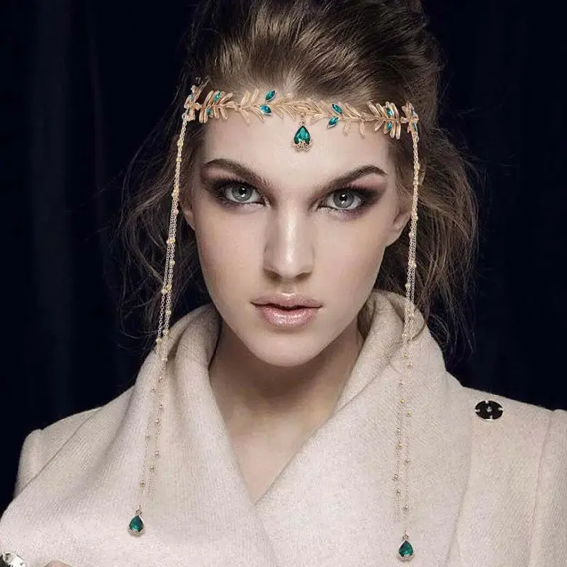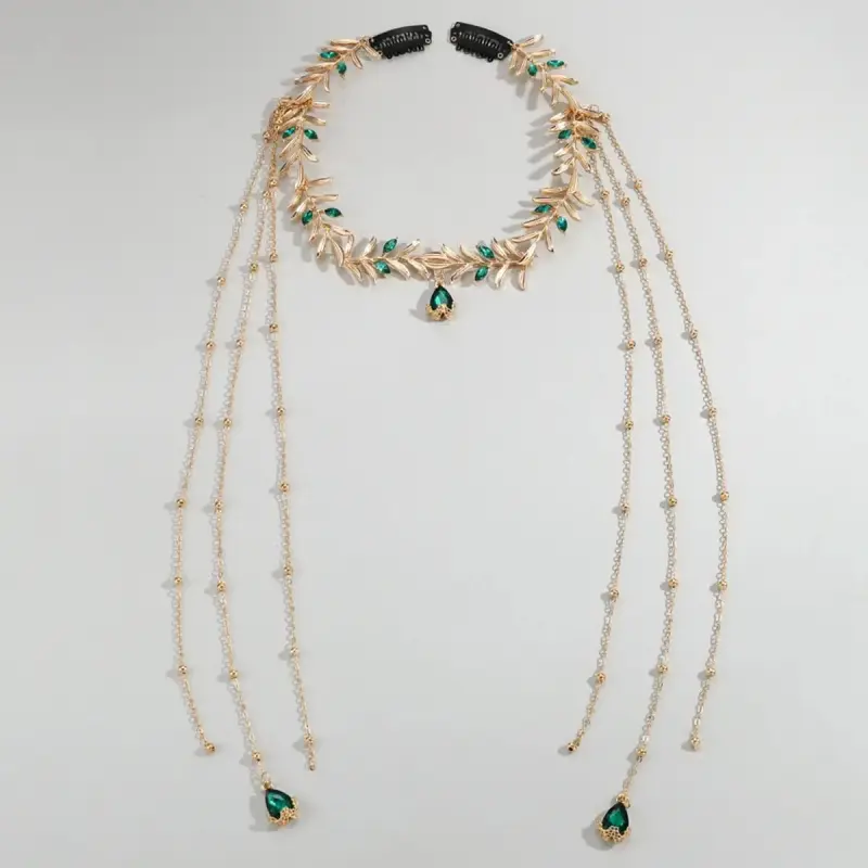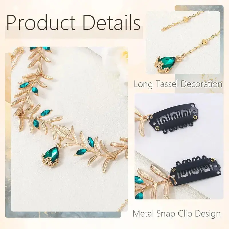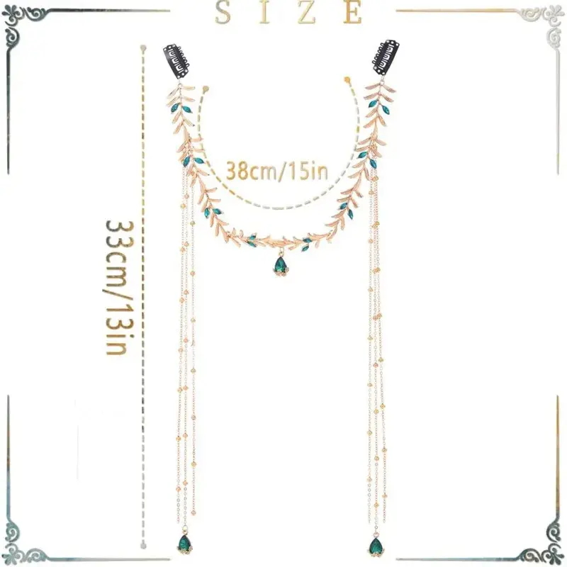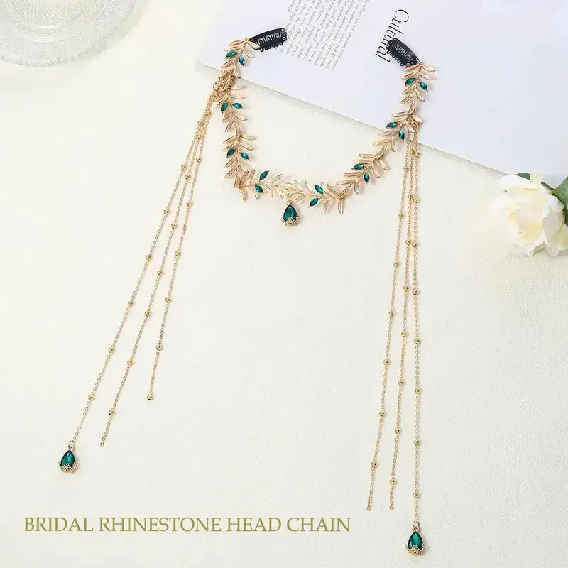 Material: High-quality Zinc alloy with Rhinestone embellishmentsDesign and Style: Boho-inspired with a Gold Leaf and Green Crystal accentUsage and Purpose: Ideal for Bridal and Fashionable OccasionsApplicable Scenario: Perfect for Weddings, Parties, and PhotoshootsSize and Weight: Lightweight with a 33cm/13inch tassel lengthPerformance and Property: Durable, Non-fading, Easy to Use with Snap Clip | Boho Headpiece Gold | Boho Gold Headpiece | **Elegance and Versatility**The Indian Boho Bridal Headdress is a shining embodiment of elegance and versatility, crafted to adorn the foreheads of fashion-forward women. Designed with a boho aesthetic, this headpiece features intricate gold leaf patterns and sparkling green crystals, creating a striking visual effect. The tassels, which extend to a generous 33cm/13inch, add a touch of movement and grace to your hairstyle. The metal snap clip ensures a secure fit, allowing you to wear this headpiece with a variety of hairstyles, from loose waves to tight updos. **For Every Special Occasion**Whether you're attending a wedding, a party, or a photoshoot, this bridal rhinestone head chain is an exquisite accessory that elevates your overall look. Its unique design, featuring a long chain on both sides, provides a sophisticated, eye-catching element that sets you apart from the crowd. The rhinestones embedded in the golden frame on the forehead add a touch of glamour, making it an excellent choice for those who love to make a statement. This headpiece is not just a piece of jewelry; it's a statement of confidence and style. **A Gift of Elegance**Looking for a thoughtful gift for a special occasion? The Indian Boho Bridal Headdress is an excellent choice. Its fashionable design and quality craftsmanship make it an ideal present for friends, wives, mothers, or anyone who appreciates unique and stylish accessories. Whether it's for a birthday, wedding, or any other special event, this gold boho headpiece is sure to be cherished and worn with pride. Its durability and non-fading properties ensure that the recipient can enjoy its beauty for many occasions to come.