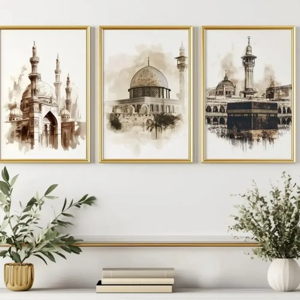 3pcs Frameless Muslim Jerusalem Mecca Medina Mosque Wall Art Print Canvas Poster, Living Room Decoration, Watercolor Painting