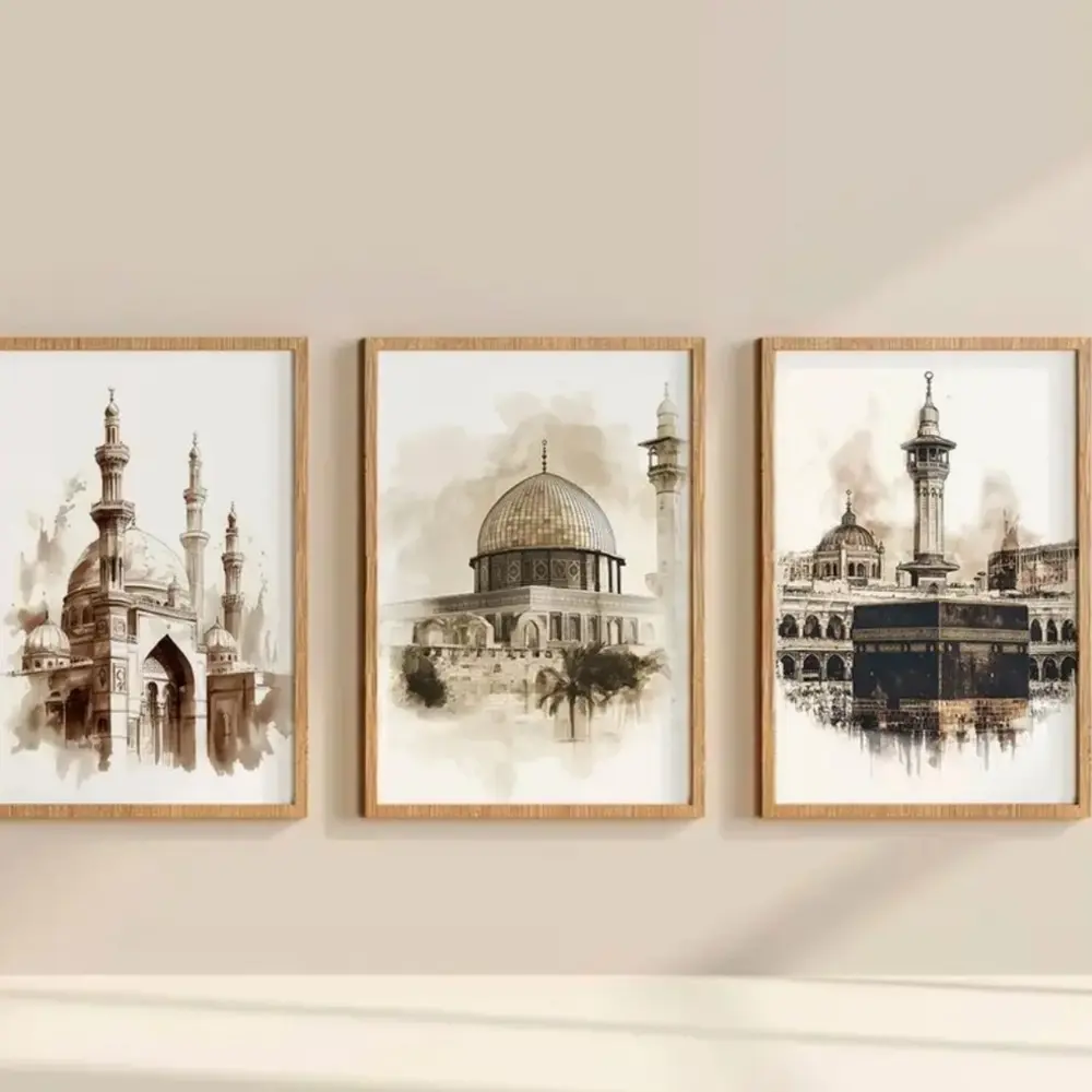 【Cultural Representation】: Featuring iconic scenes from Jerusalem, Mecca, and Medina, this artwork celebrates significant Islamic landmarks.
