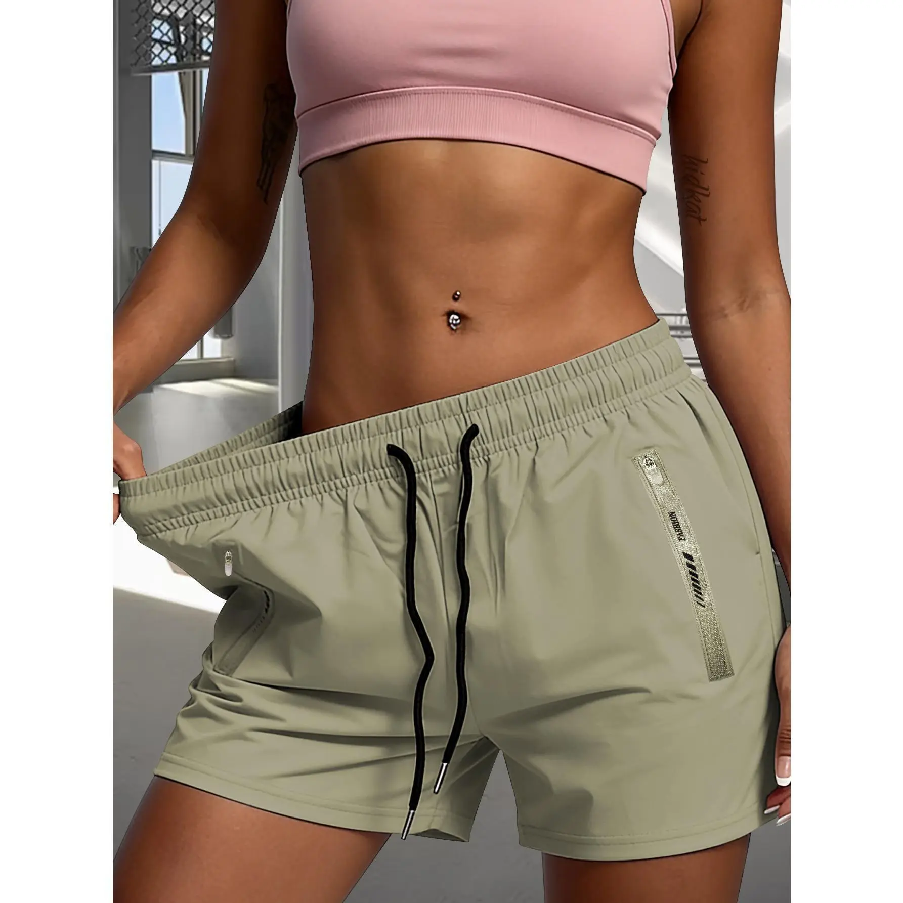 5. Women's lightweight breathable drawstring zipper pocket sports and casual shorts Multi color optional loose fit plus size fitness running five point casual pants Side pocket letter printed versatile casual shorts for daily commuting
