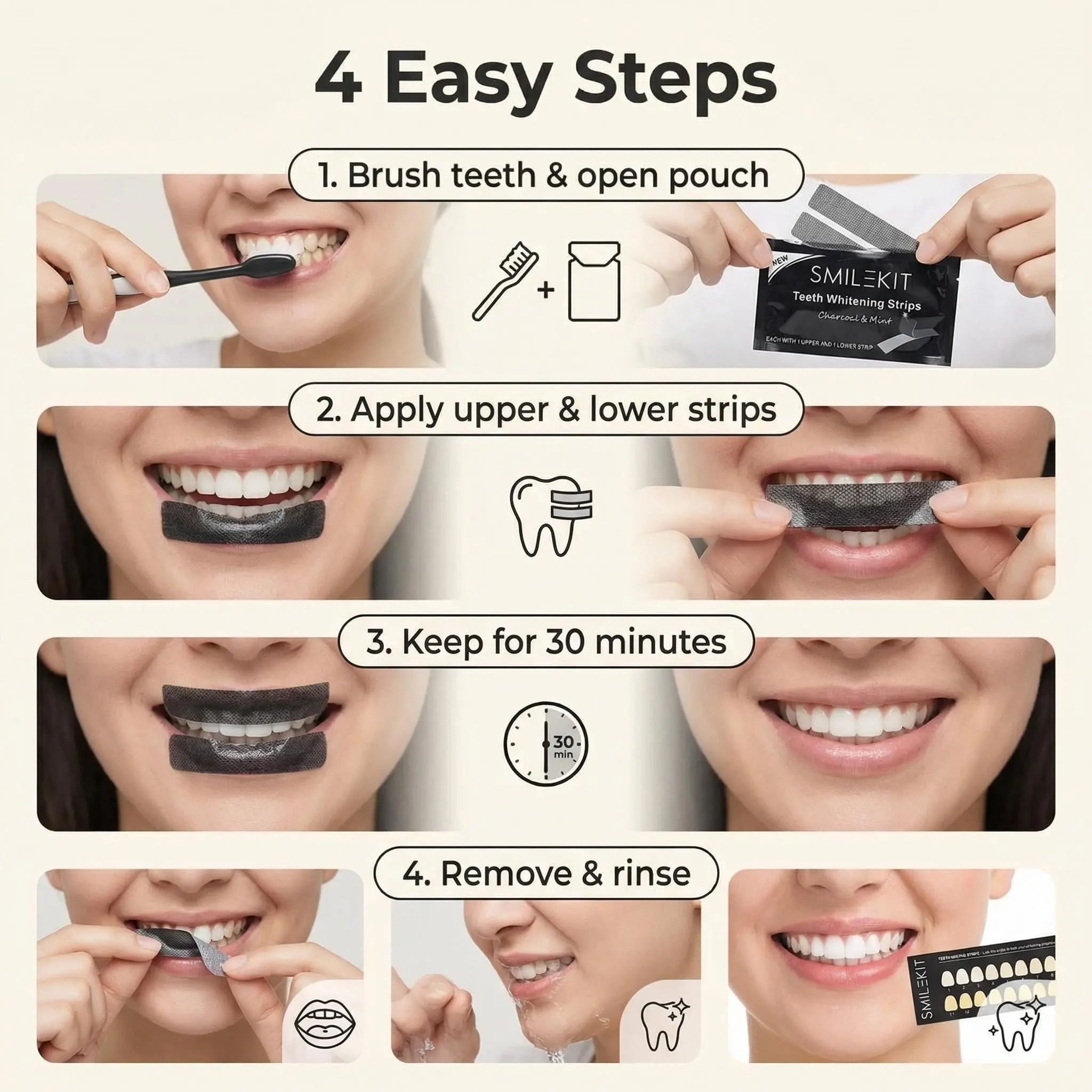 Our advanced adhesive technology ensures a comfortable and secure fit-no slipping, sliding, or sticky residue.You can talk freely while whitening and peel off the strips easily after 30 minutes.Perfect for instant whitening anytime, anywhere.