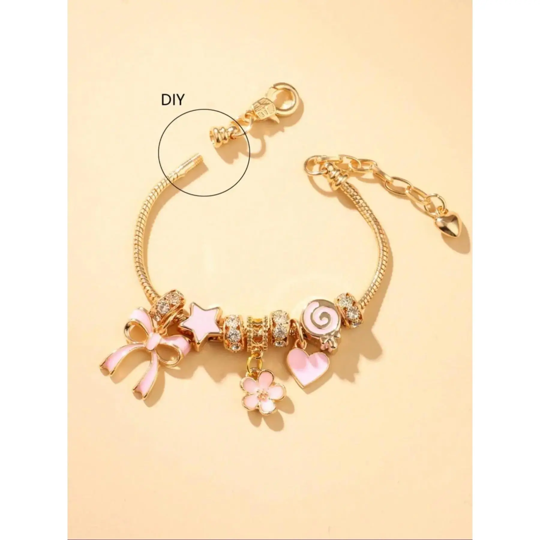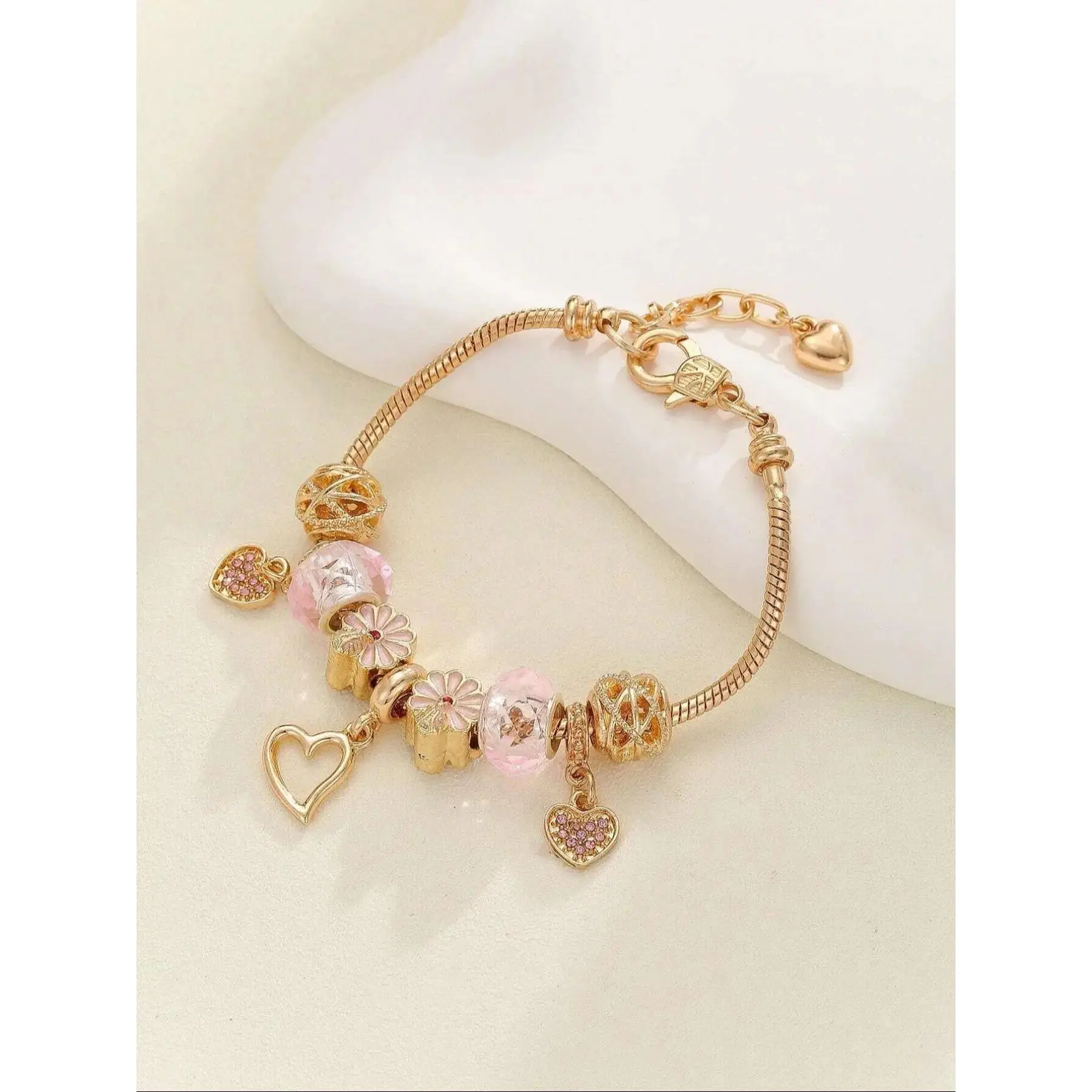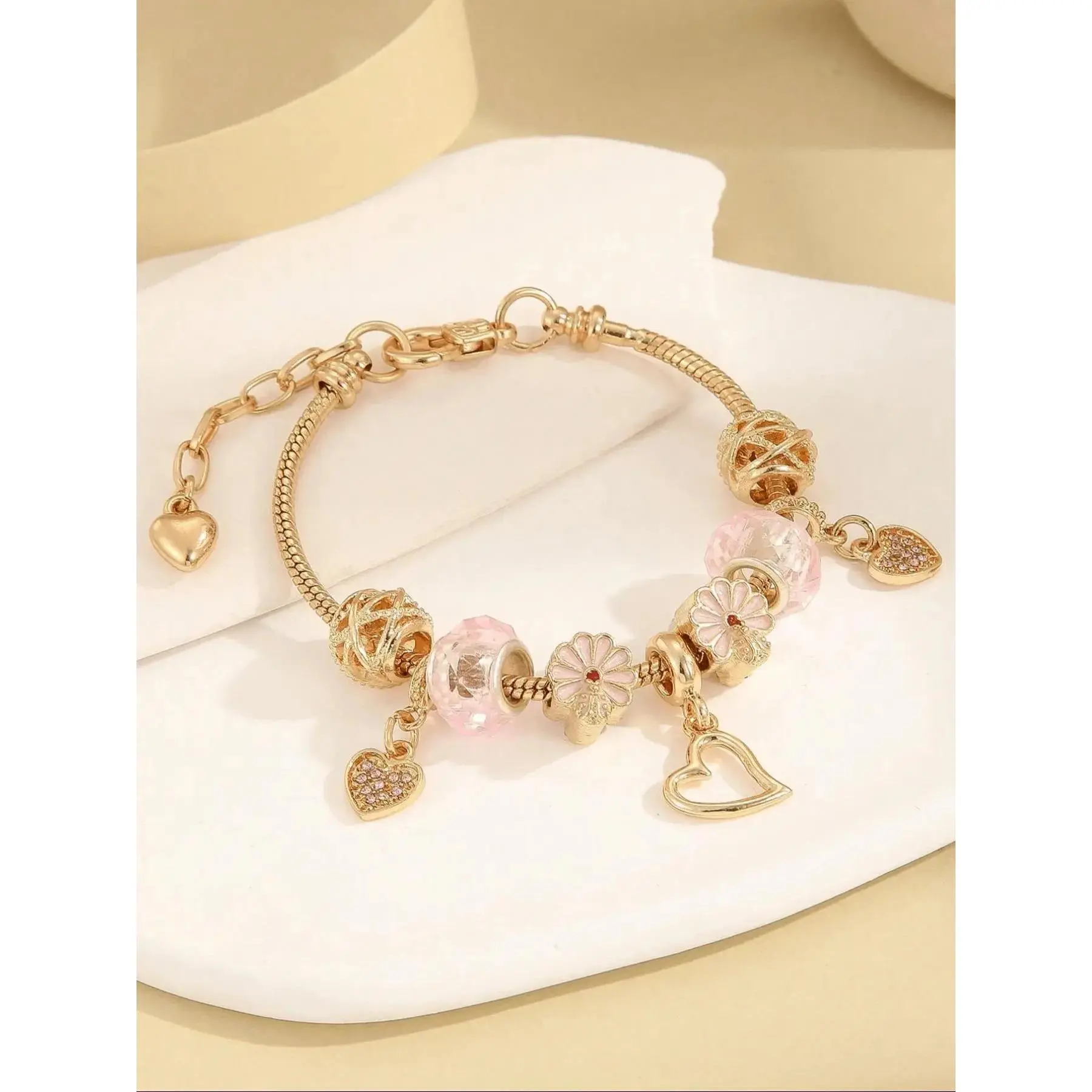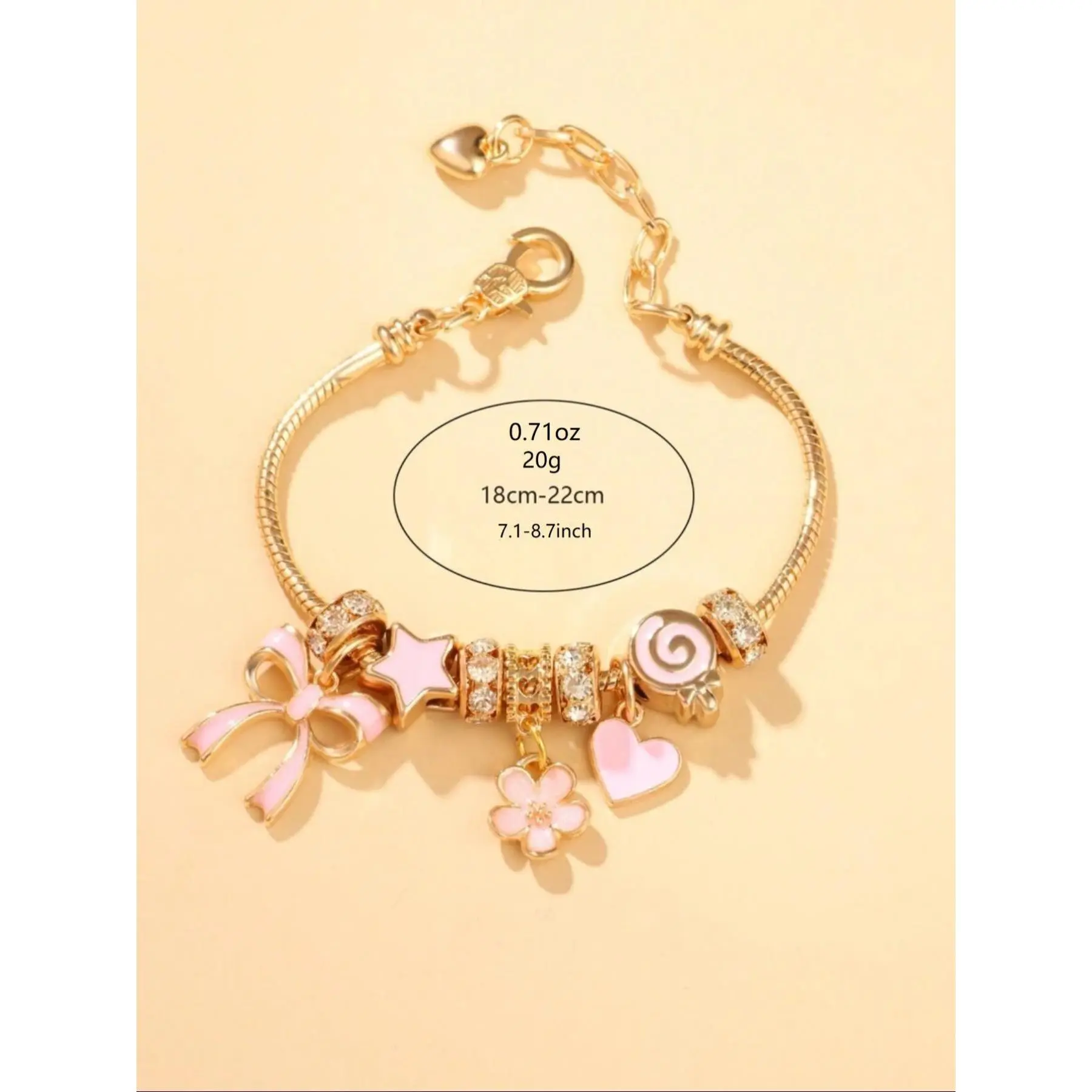 Cute Bow & Heart & Flower Design Charm Bracelet, Rhinestone Decorated Bracelet for Women & Girls, Trendy All-match & Exquisite Jewelry for Birthday Gift, Heart Shaped Bracelet