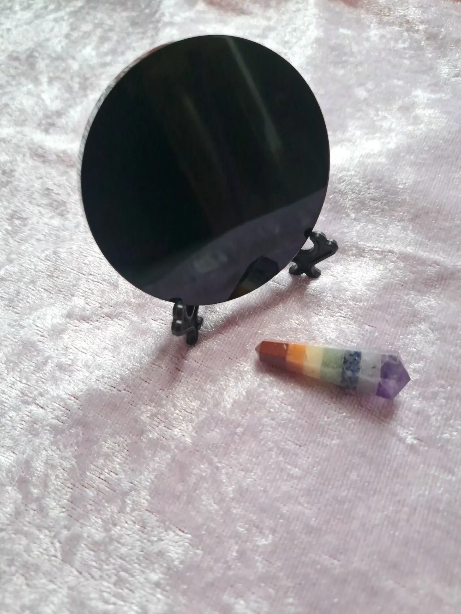 What’s Inside (2 Pieces): Black Obsidian Mirror (with Stand) – A powerful shield to clear your space and support self-reflection.
