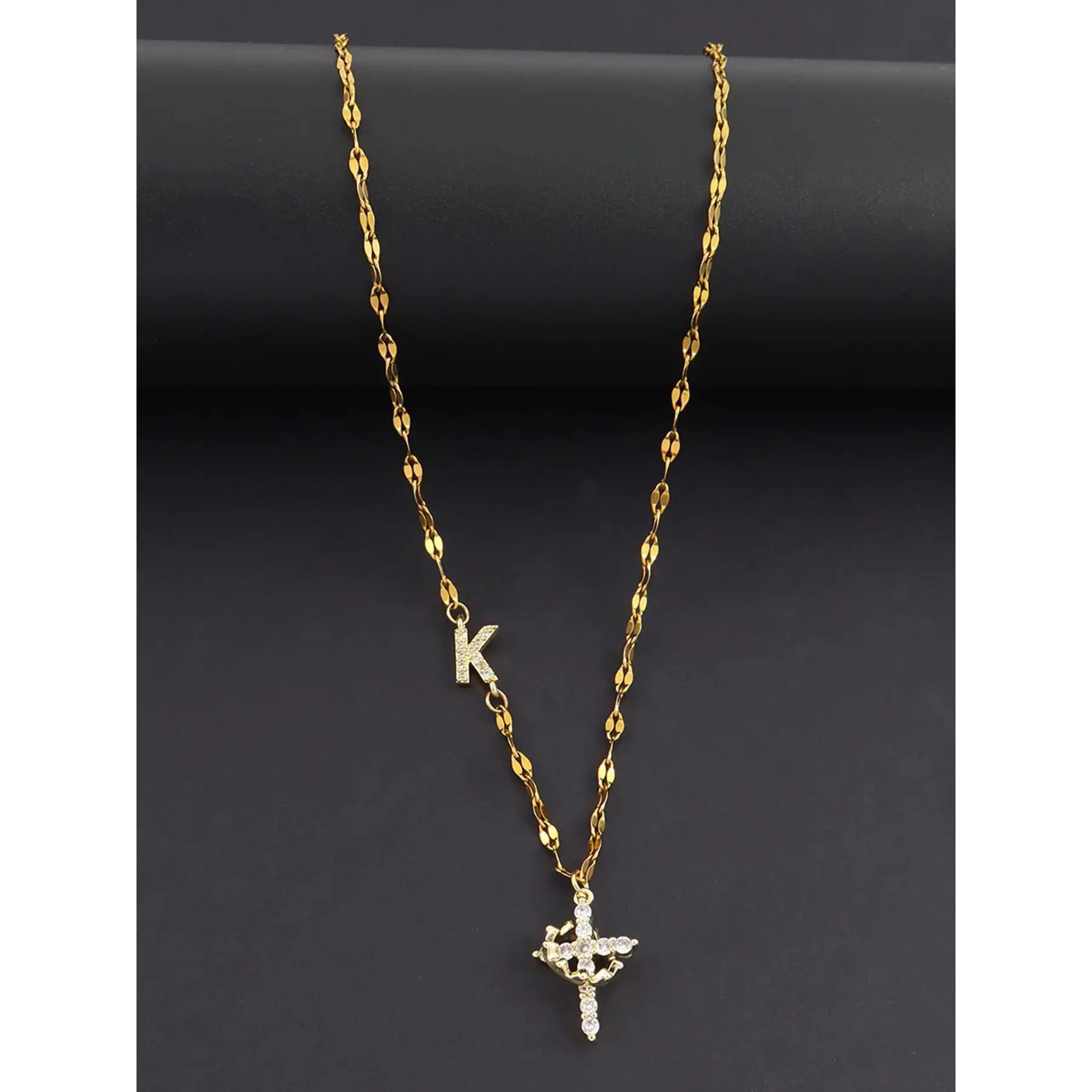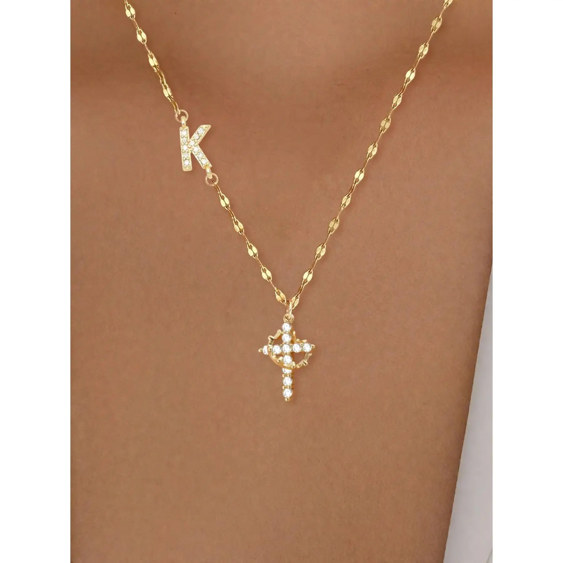 Women's Stainless Steel Necklace with Zirconia Cross Crown Initial Pendant, Casual Fashion Lip Chain Jewelry for All Seasons