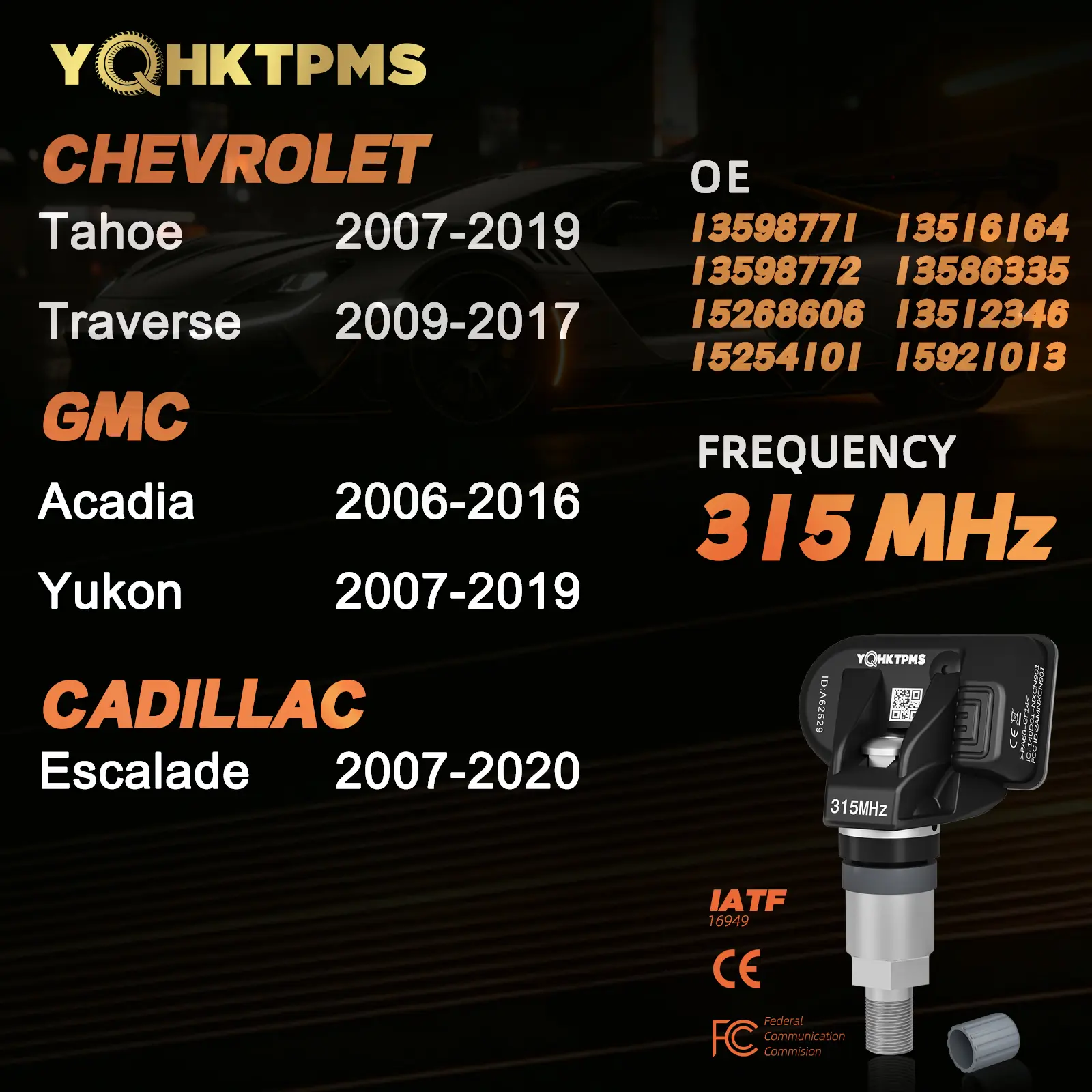 ·【GM SUV/MPV TPMS Reset Solution】 :-CHEVROLET Tahoe (2007-2019) | Traverse (2009-2017). :-GMC Yukon (2007-2019) | Acadia (2006-2016). :-CADILLAC Escalade (2007-2020). 【Frequency】315MHz 【OE】13598771,13598772,15268606,15254101,13516164,13586335,13512346,15921013 etc. 【NO DIY】 Pre-programmed, not programmable. Requires professional tools for activation and learning.