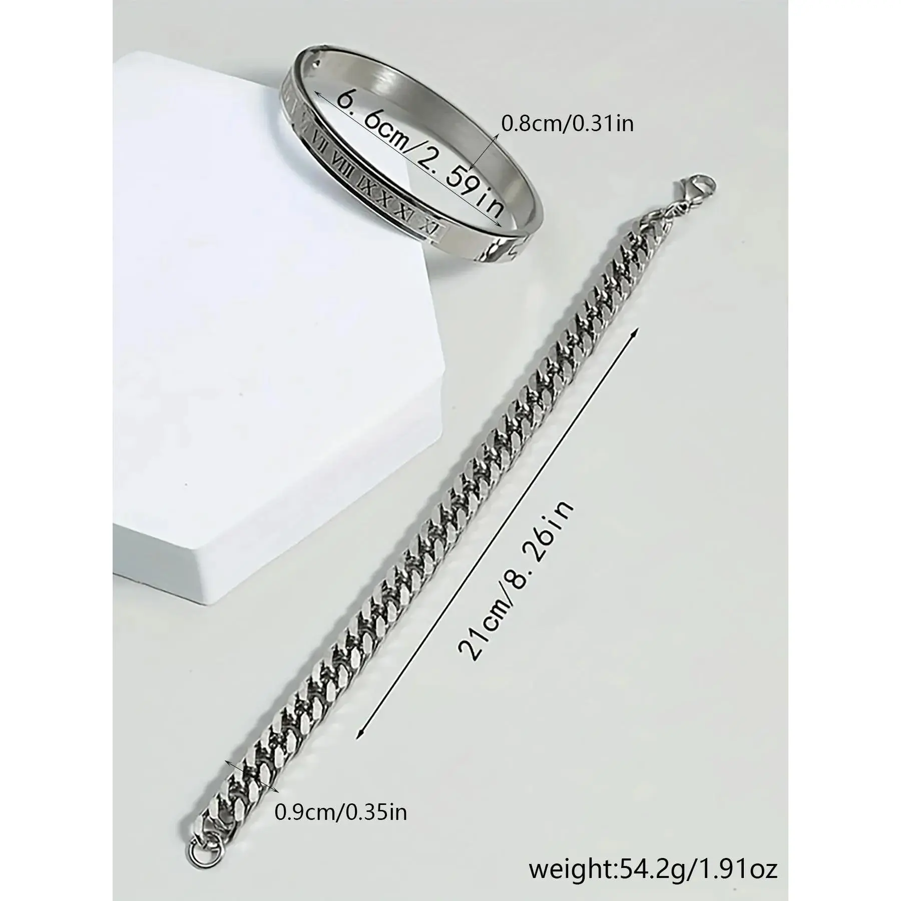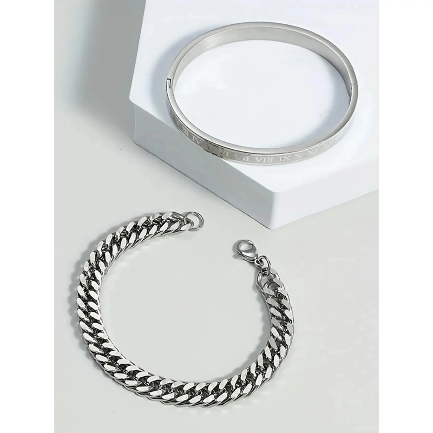 2counts/set Men's Summer Plain Stainless Steel Link Chain Bracelet & Roman Numerals Design Bangle, Stainless Steel Jewelry for Birthday Gift, Fashion Bracelets