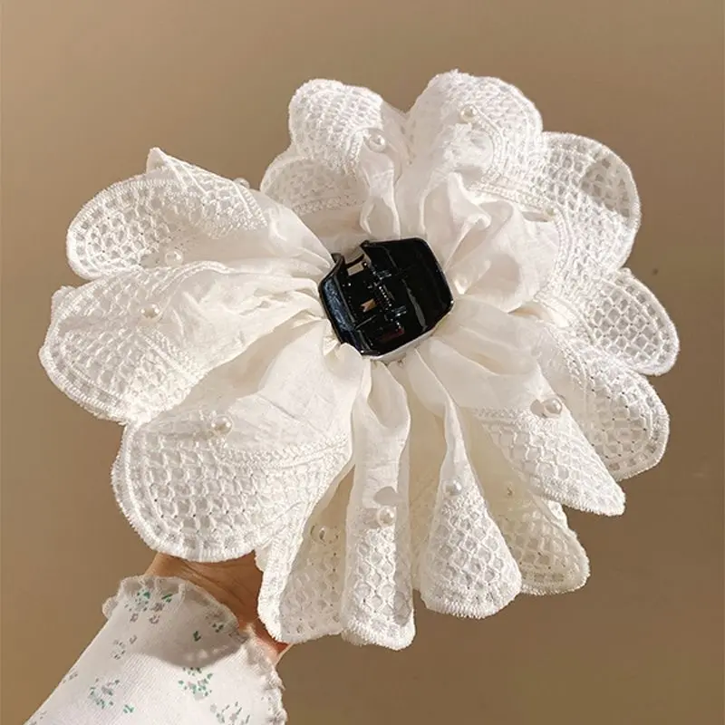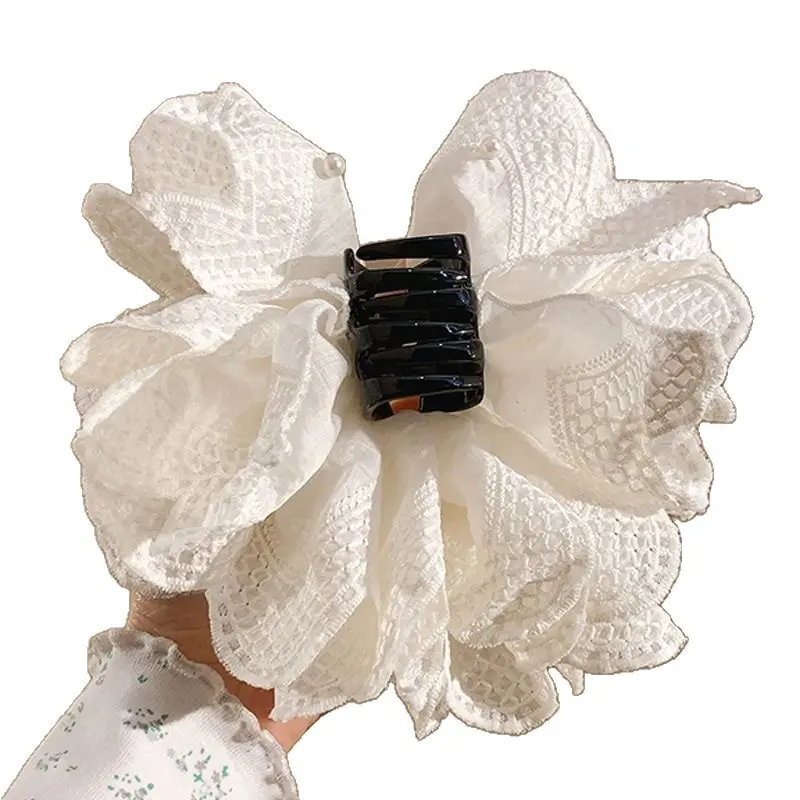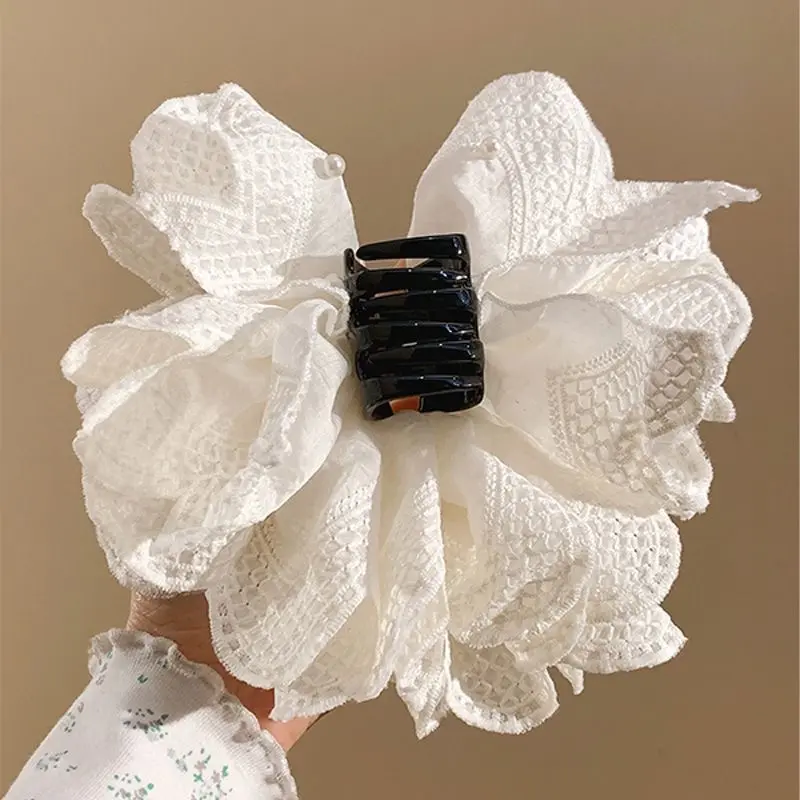 This lace flower hair clip features a high-quality acetate base, paired with multi-layered three-dimensional lace petals. The intricate hollow patterns are delicate and refined, with built-in pearl embellishments. The overall design is soft and ethereal, with a high level of fluffiness, making it easy to use for both half-up and fully-up hairstyles. The clip teeth bite tightly, ensuring a secure hold without slipping. Whether for daily commuting or a date or party, it is a stunning hair accessory that enhances your look