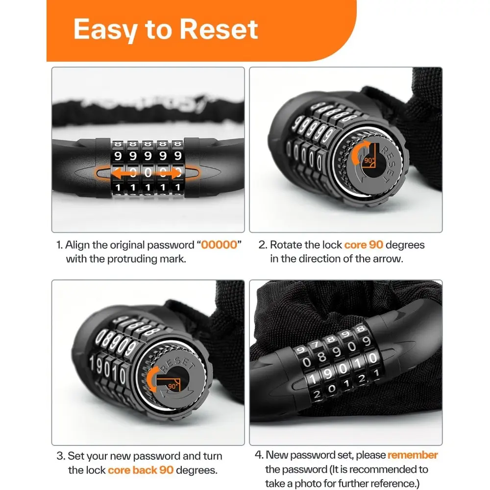 ·High Security & Keyless Design: Say goodbye to the hassle of carrying keys and hello to keyless convenience. The advanced 5-digit combination lock offers unparalleled protection, with up to 100,000 possible combinations, making it virtually impossible to crack. This bike chain lock is the perfect choice for those who value safety and convenience above all else.